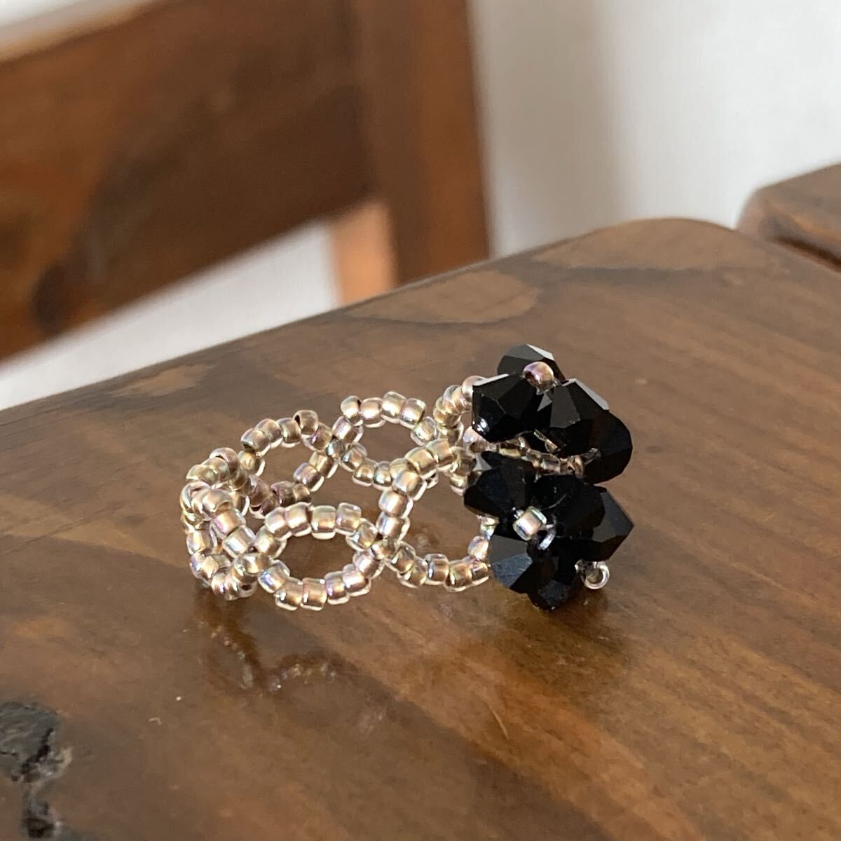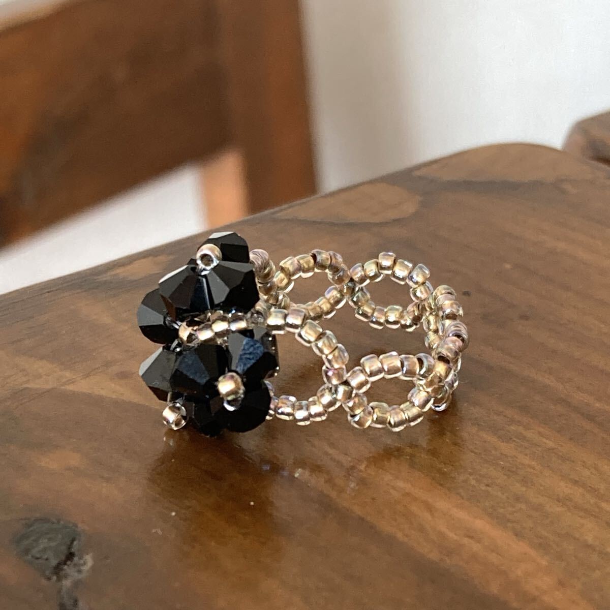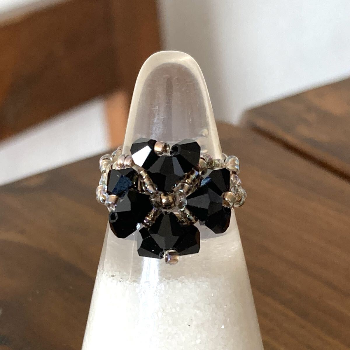 ビーズ リング 指輪 スワロフスキーのクローバー風リング 黒×ゴールド 14-16号です。