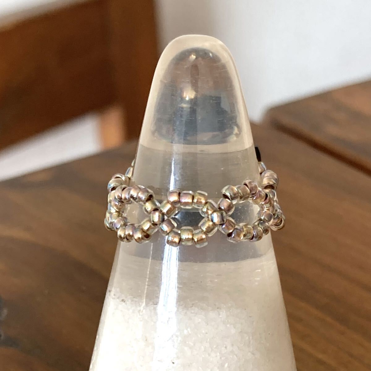 サイズは指周り約5.5cmです。(テグスなので前後します。)