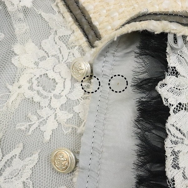 素材 | 表地 レース:ナイロン66% ポリウレタン18% コットン16% 下地:キュプラ100% 上衿別布:キュプラ100% ラベル別布:ウール53% アクリル41% ナイロン6% フリル・テープ:ナイロン100% |