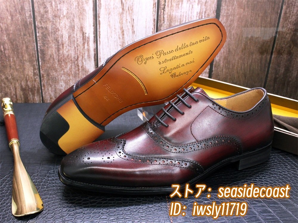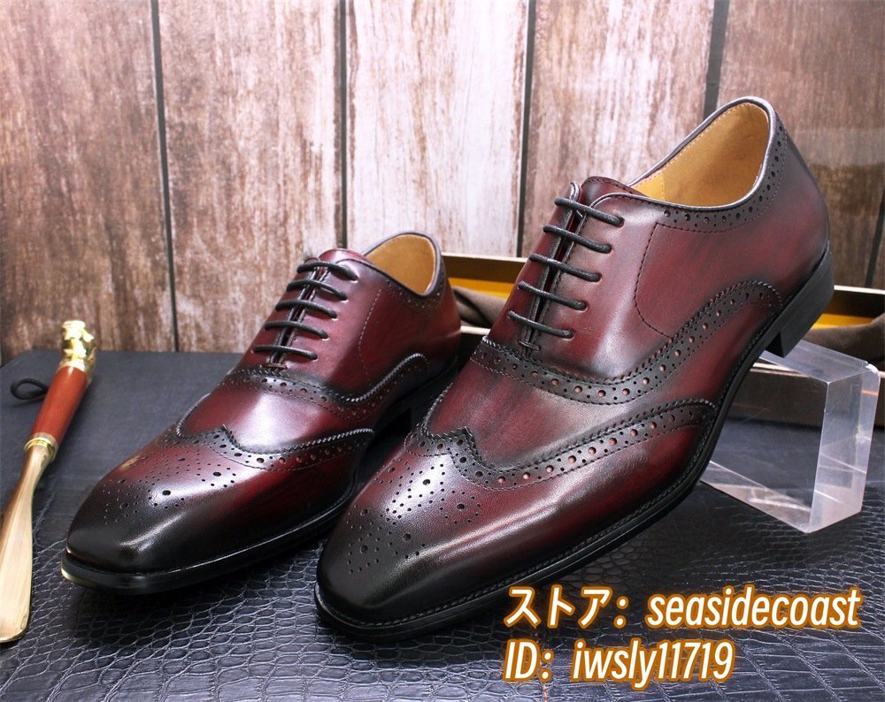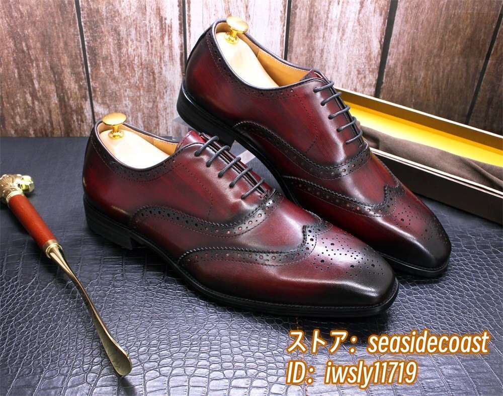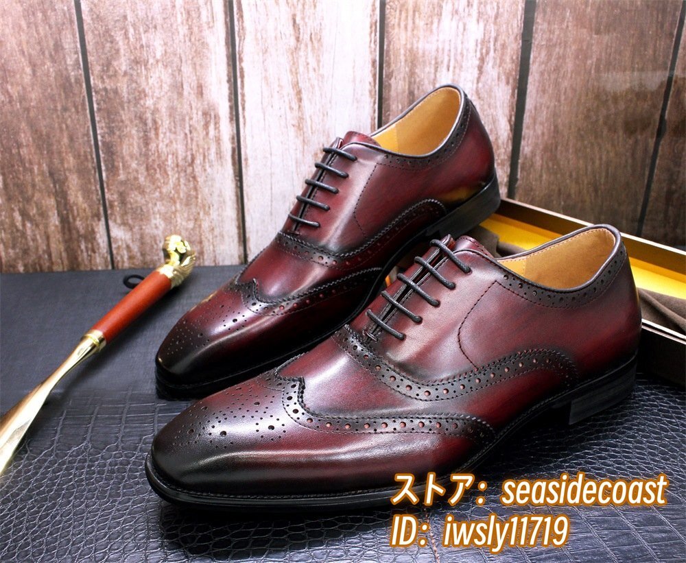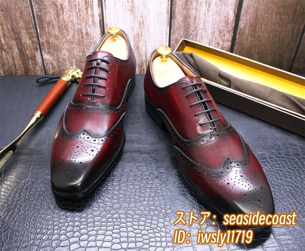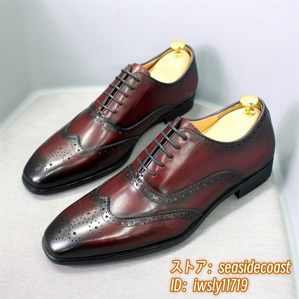 定価9万◆最高級 本革 ビジネスシューズ 職人手塗仕上げ 彫り 牛革 レザーシューズ メンズシューズ 新品 革靴 フォーマル レッド 27.5cm