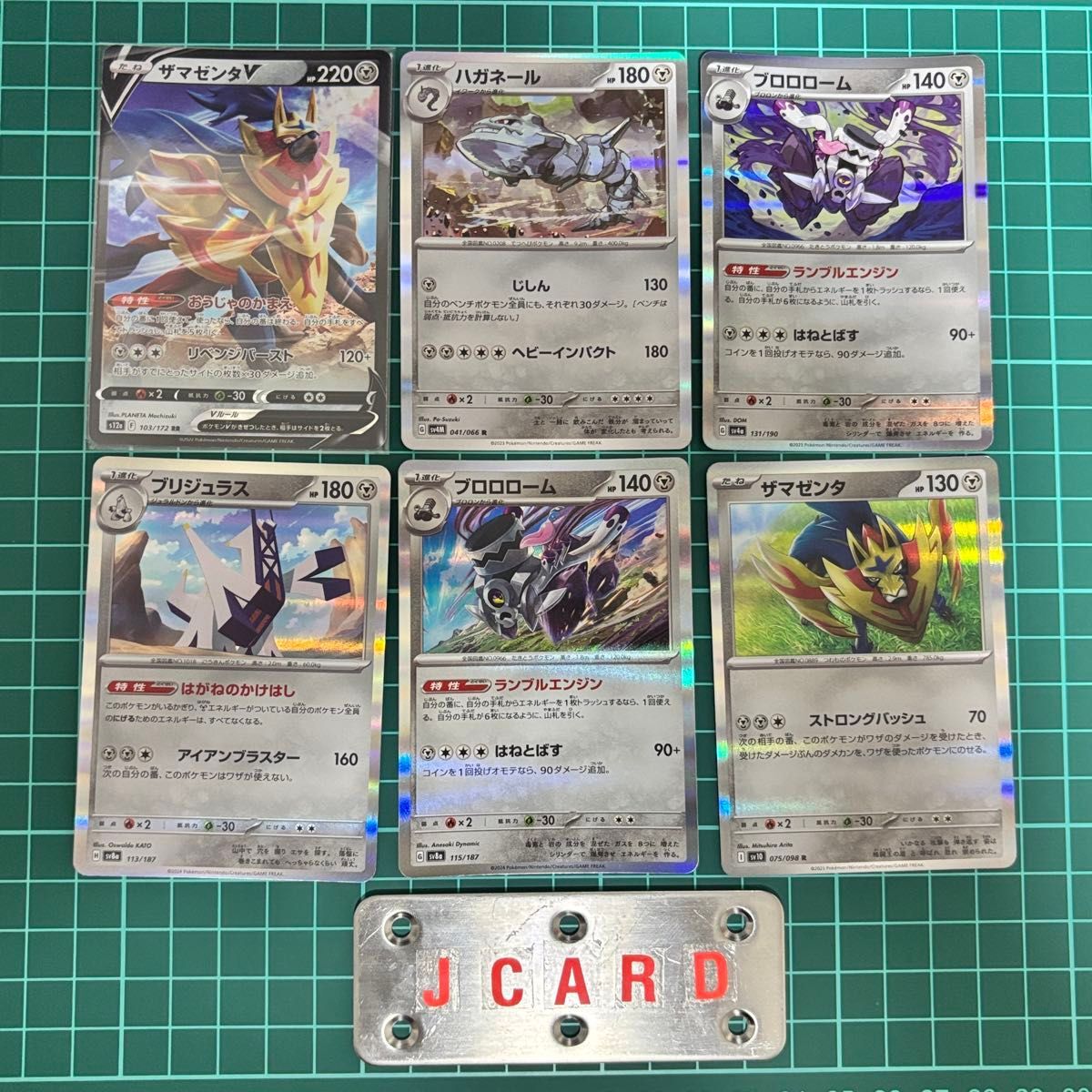ポケモンカードのザマゼンタV、ハガネール、プロロローム、ブリジュラスのまとめ売りです。目立った傷や汚れはなく、比較的綺麗な状態です。