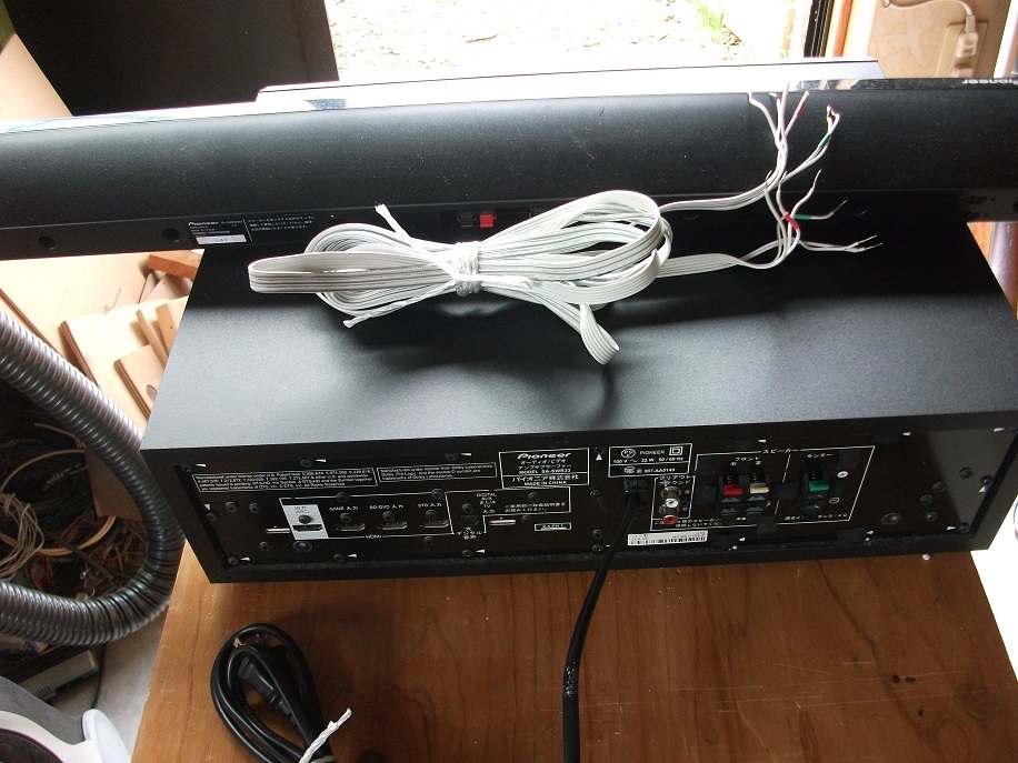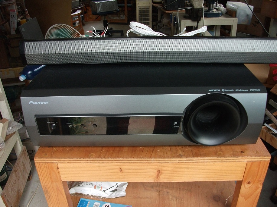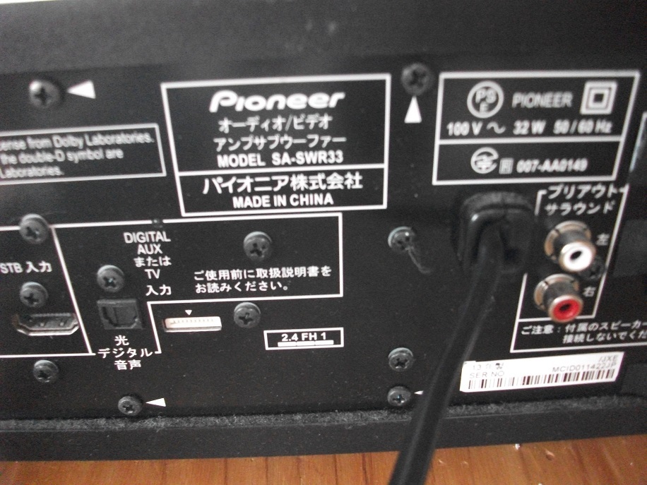 パイオニアのサウンドスピーカー SA-SWR33です。光ケーブルを繋いだら正常動作しました。出品は本体、スピーカー、両者接続用のケーブルのみです。