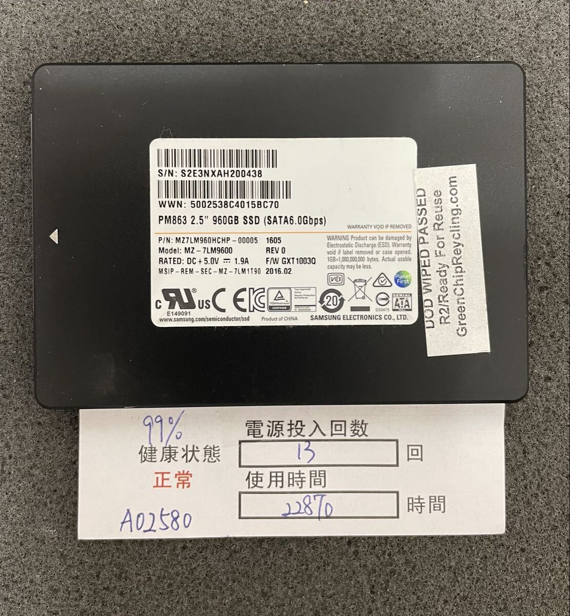 A02580/中古品 /2.5インチSATA SSD/samsung 960GB/ 動作確認済み /返品返金対応 /納品書発行可(商品説明文ご確認下さい)