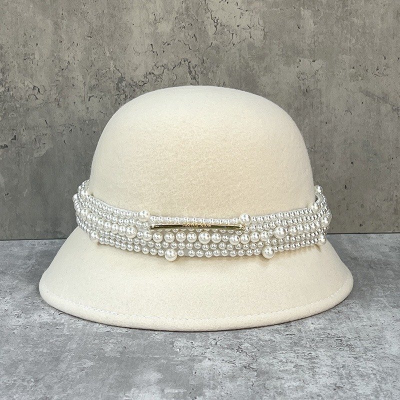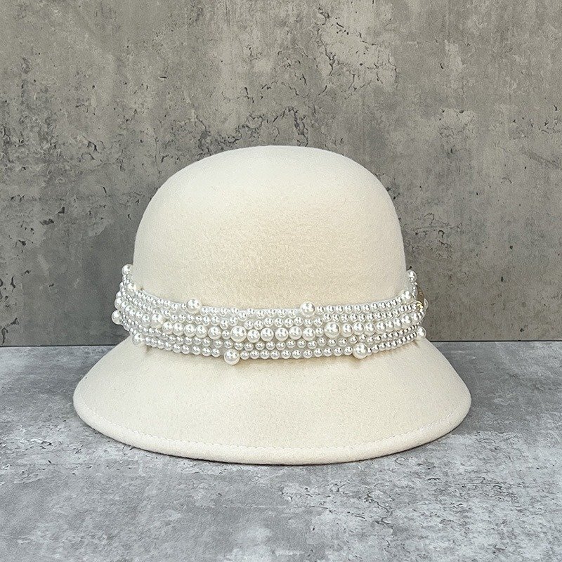 高級 パールチェーン飾りバケットハット フェルト帽子 秋冬 ウール 帽子 優雅 結婚式 パーティー帽子 ウェディング 小顔効果 防寒帽子 白