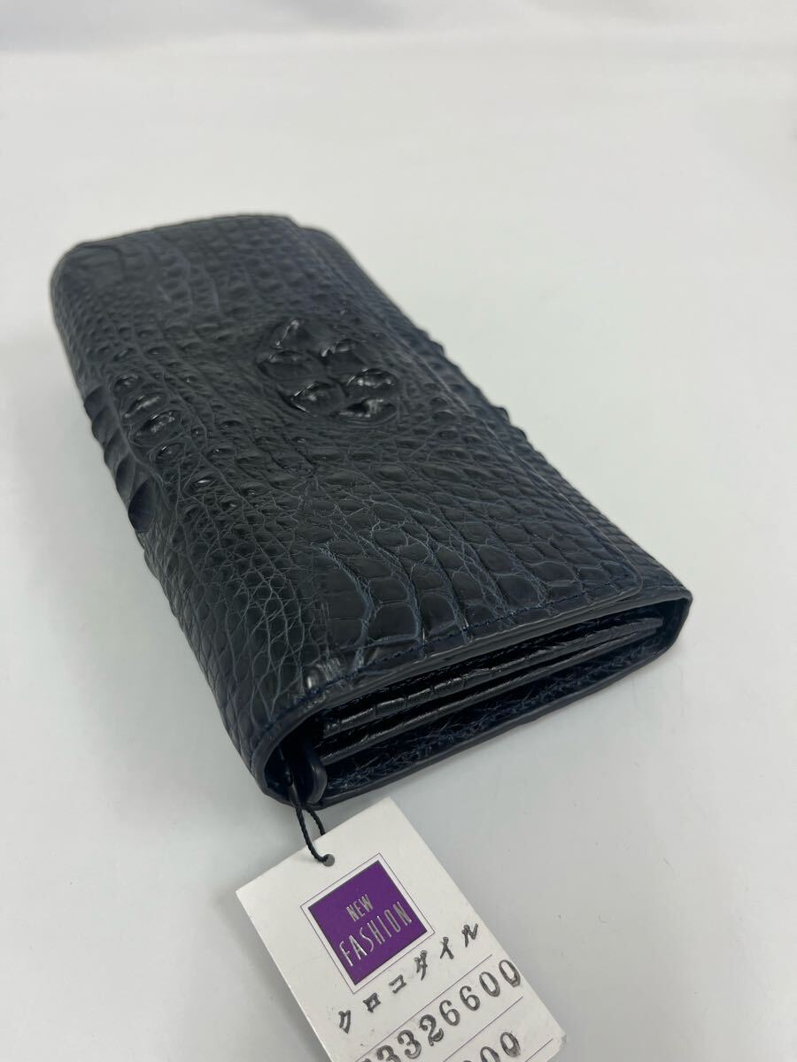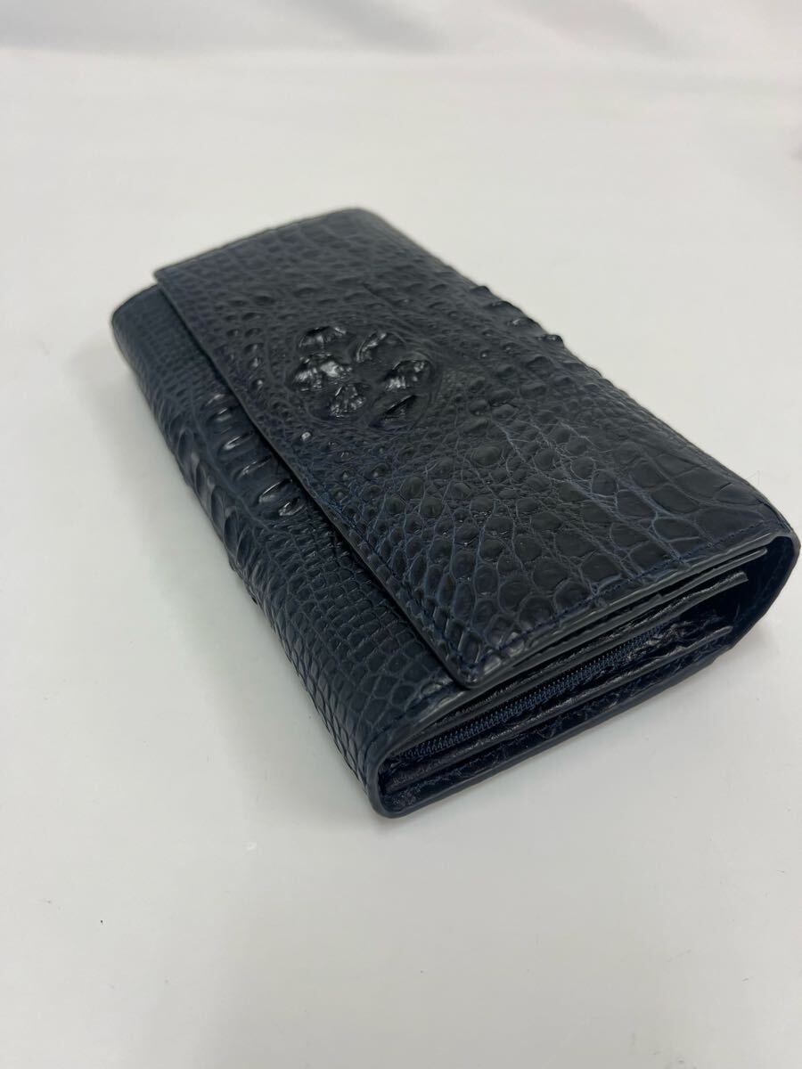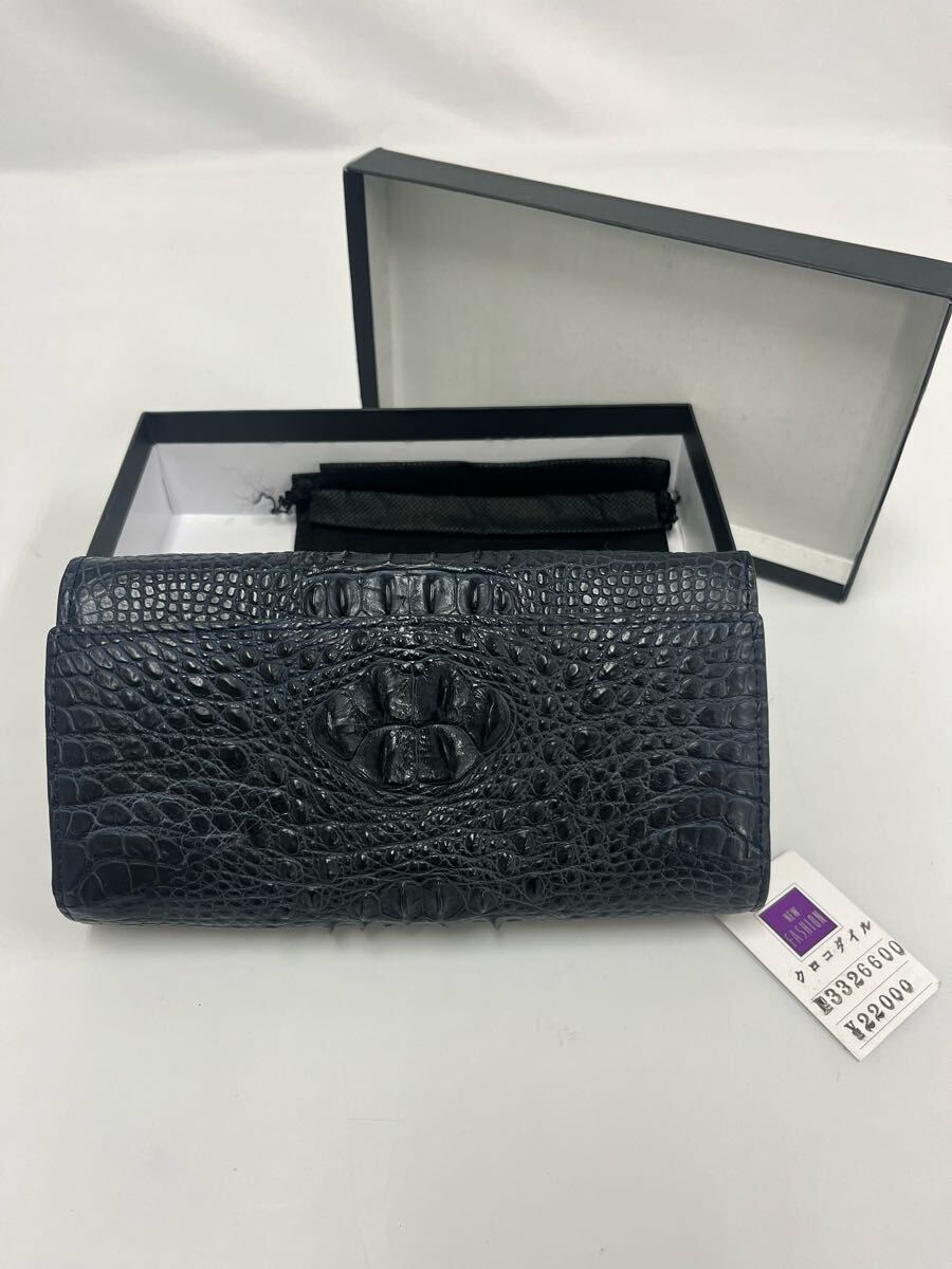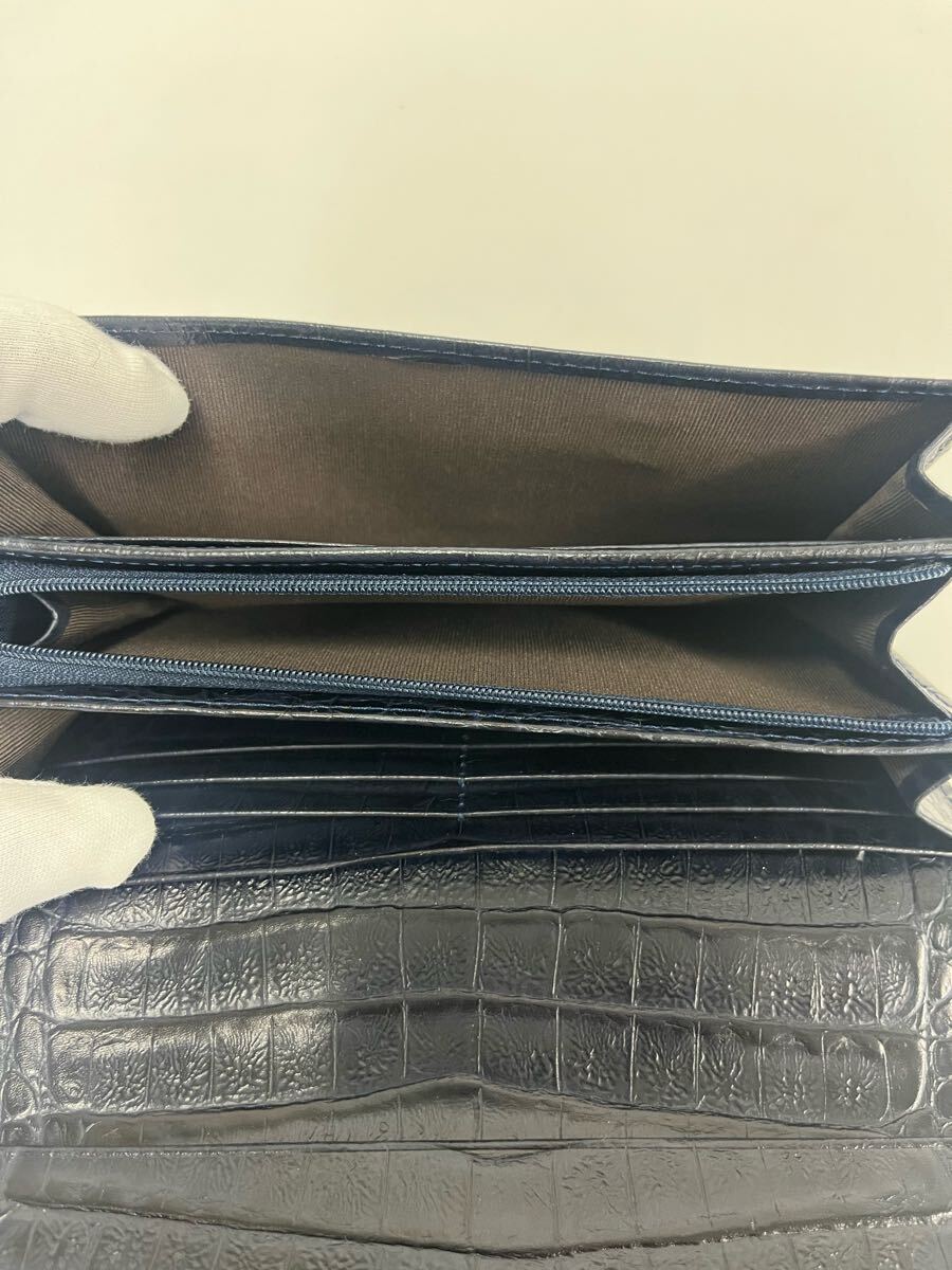 色は**ダークネイビー(濃紺)**で、光の加減によってはブラックに近い色合いに見える、非常に高級感のある逸品です。クロコダイルの美しい鱗模様(センター取りと思われる豪華なデザイン)が魅力的で、男女問わずお使いいただけるデザインです。