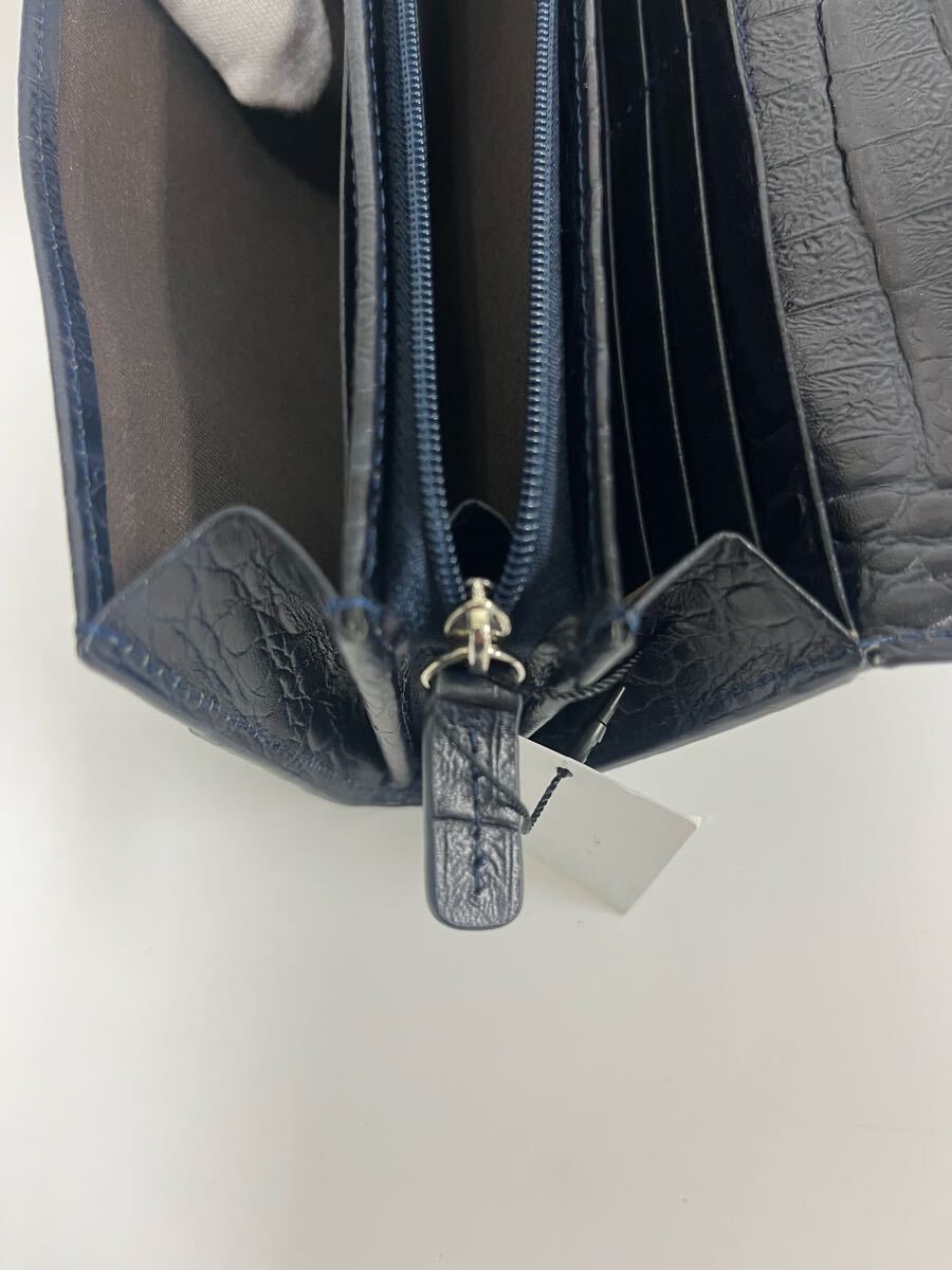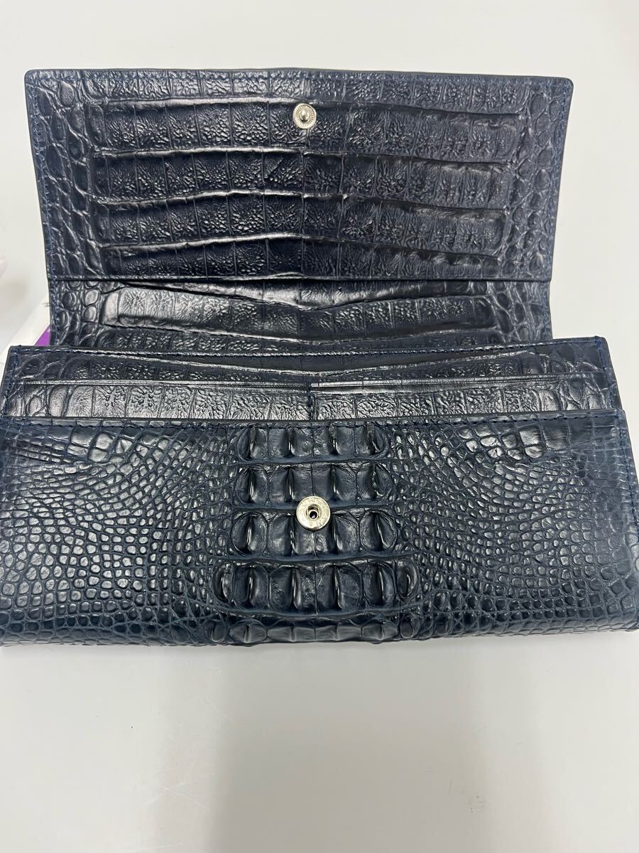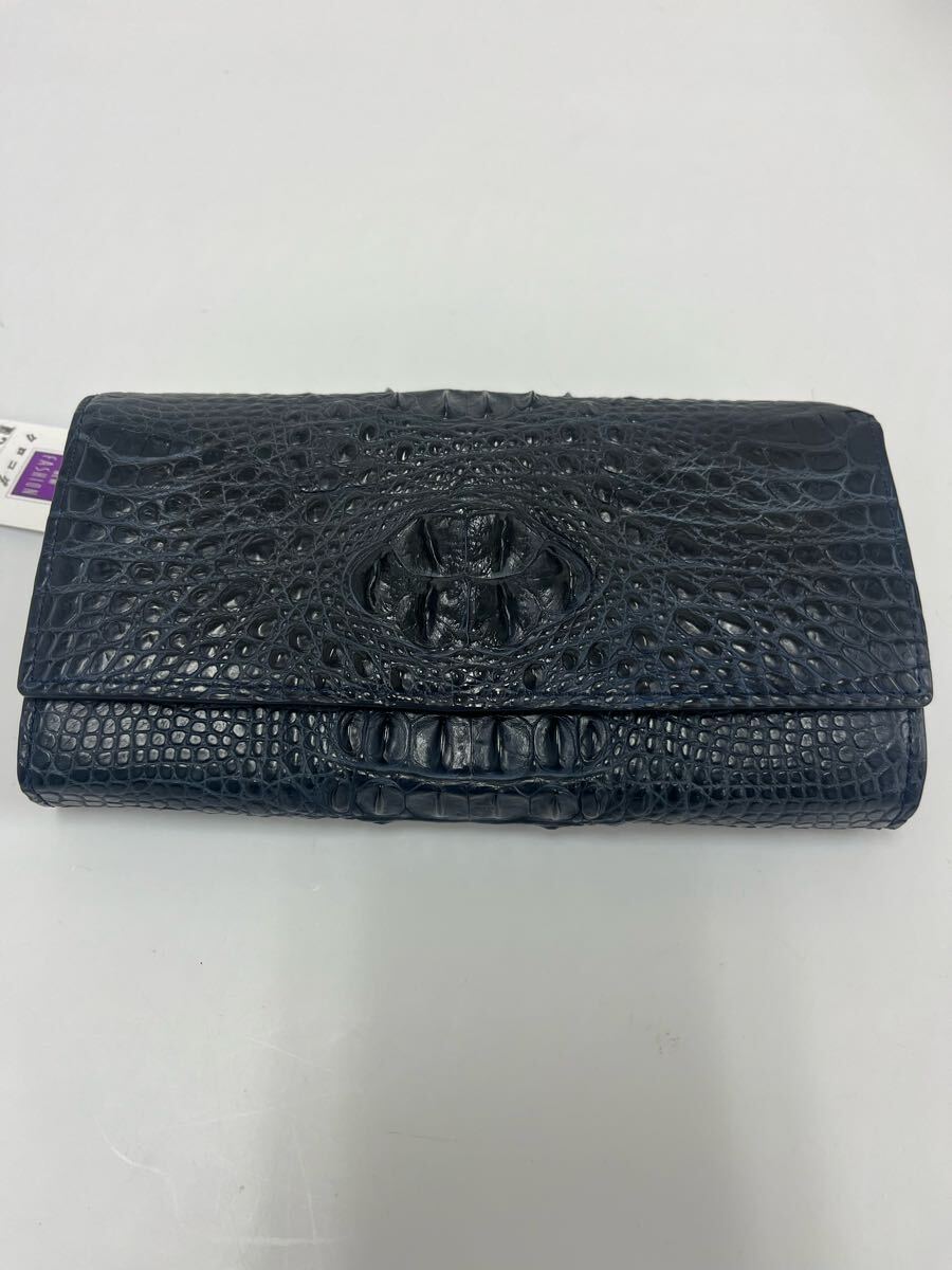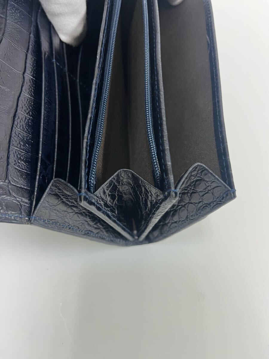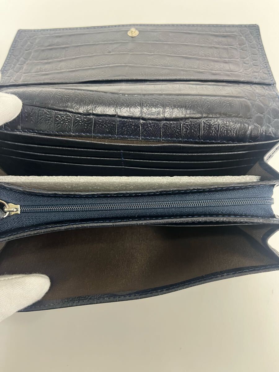 色は**ダークネイビー(濃紺)**で、光の加減によってはブラックに近い色合いに見える、非常に高級感のある逸品です。クロコダイルの美しい鱗模様(センター取りと思われる豪華なデザイン)が魅力的で、男女問わずお使いいただけるデザインです。