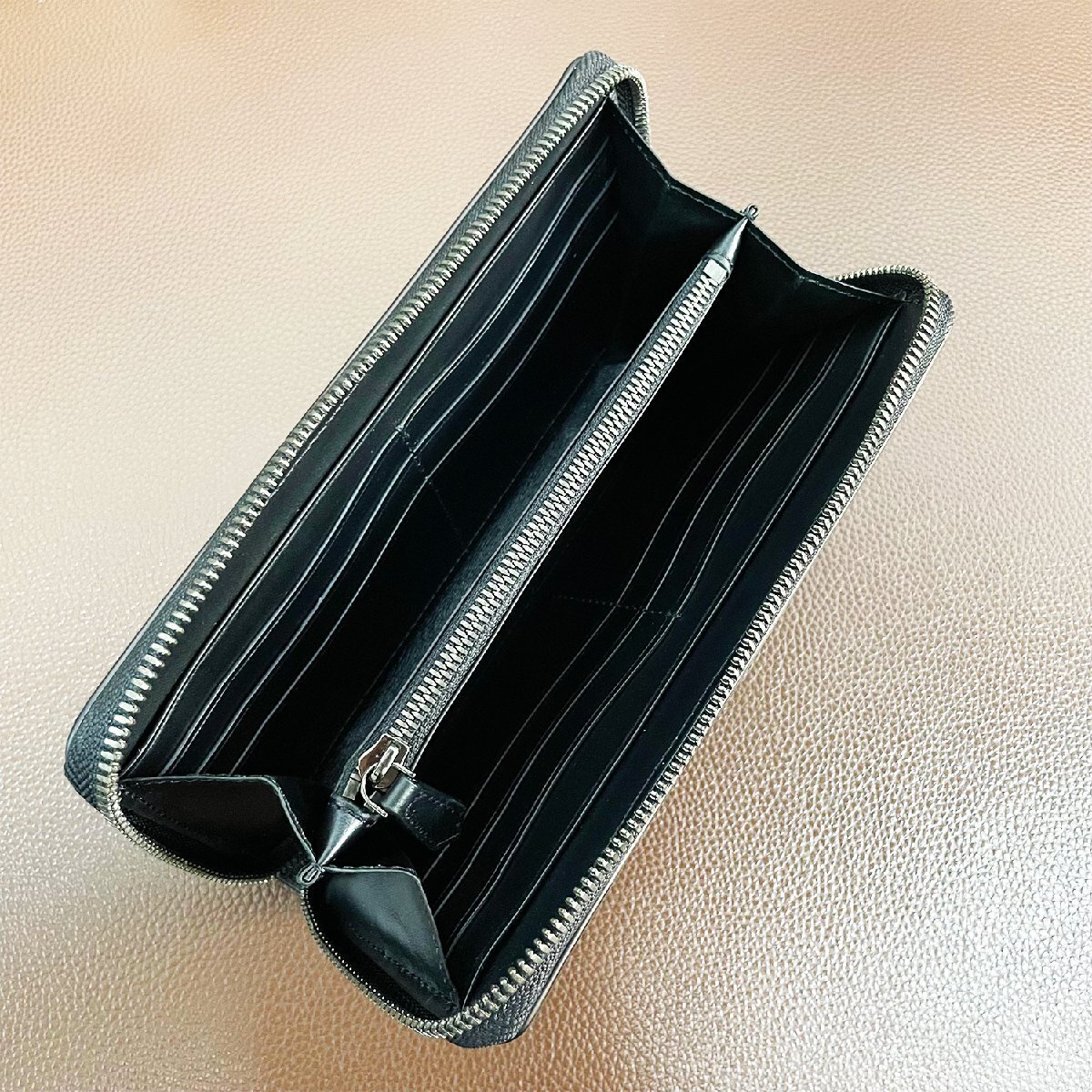 染料の開発成功は製作の一番重要な問題の解決に繋がり、職人が一つ一つの工程にこだわり作り上げた牛革長財布です。一番こだわりの工程はカリグラフィーの彫り込みと革の着色です。