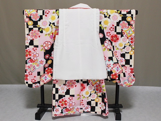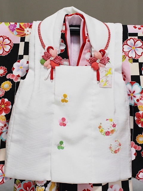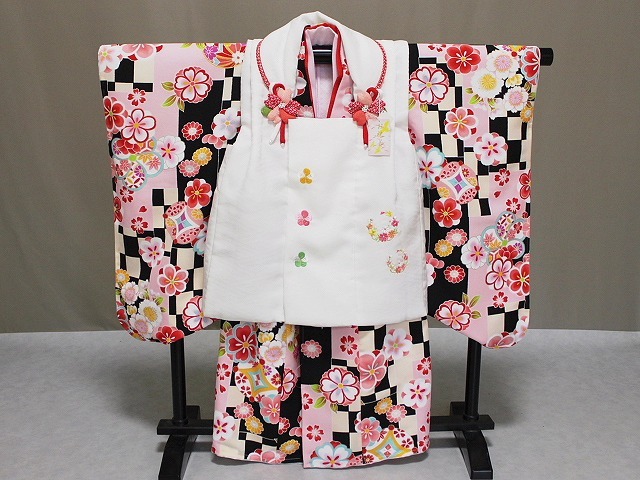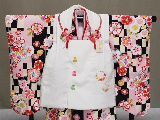 A1449-03 塚句野世 高級ポリエステル地の三歳用被布セットです。 手触りも絹と間違えてしまうほどの質感となっています。 こちらのかわいい被布セットをお子様用の一枚として 家族の記念の着物としてお持ちになってはいかがでしょうか。 足袋は付いておりませんが お子様のサイズに合わせてお求め下さい。 当ショップにもございます。へこ帯なども多数ございますので ぜひお寄りくださいね。 柄などは、着物はうすいクリーム色とうすいピンク色・黒色との市松柄地に花柄となっています。 所々金色にて縁取り加工が施されています。重ね衿は赤色です。 長襦袢はピンク色です。重衿は若草色です。 被布は、さや型地紋の見える白地に ピンクやみどり・山吹色などにて花柄刺繍があります。 巾着・草履は赤色です。◎ | ||||||||||