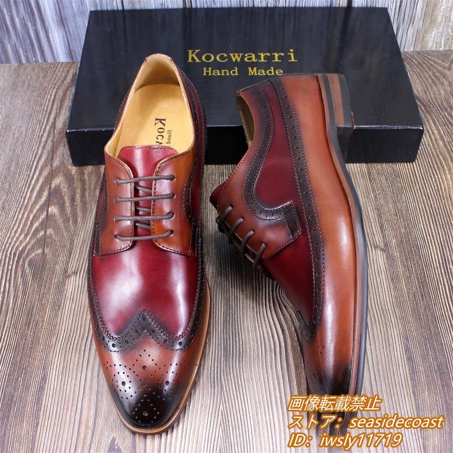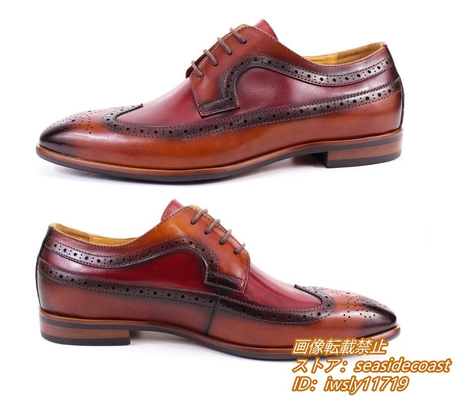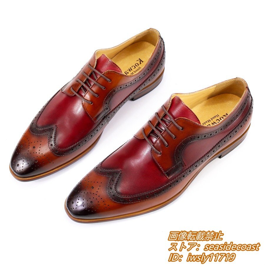 定価9万★ビジネスシューズ メンズ 本革 レザーシューズ ハンドメイド 彫り 高級 牛革 シークレット 紳士靴 結婚式 革靴 レッド 27.0cm