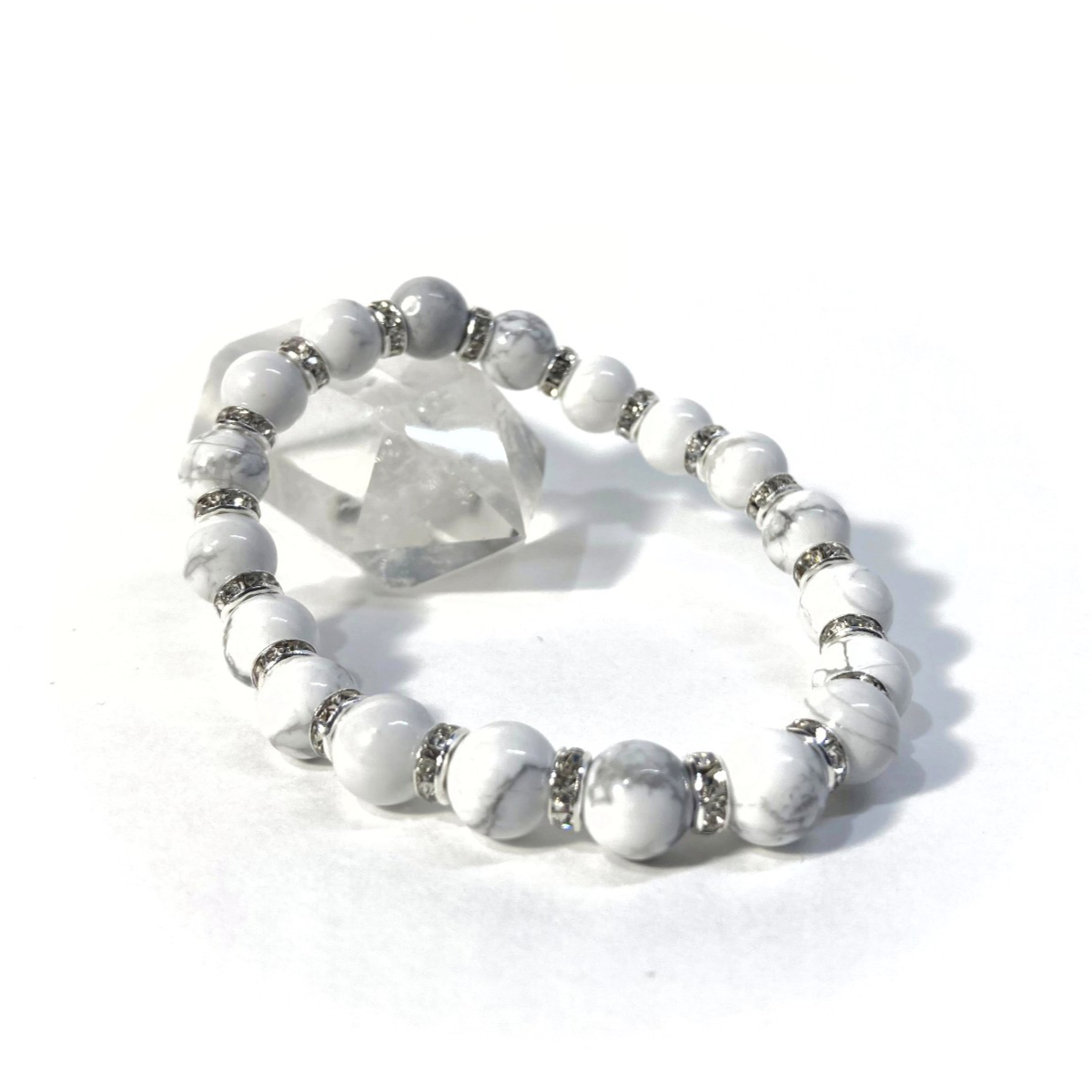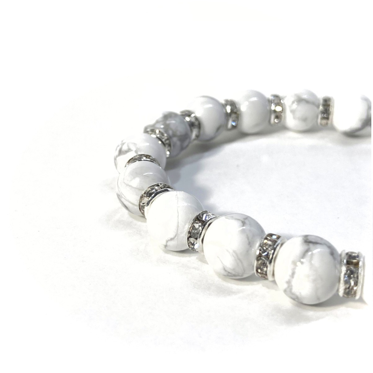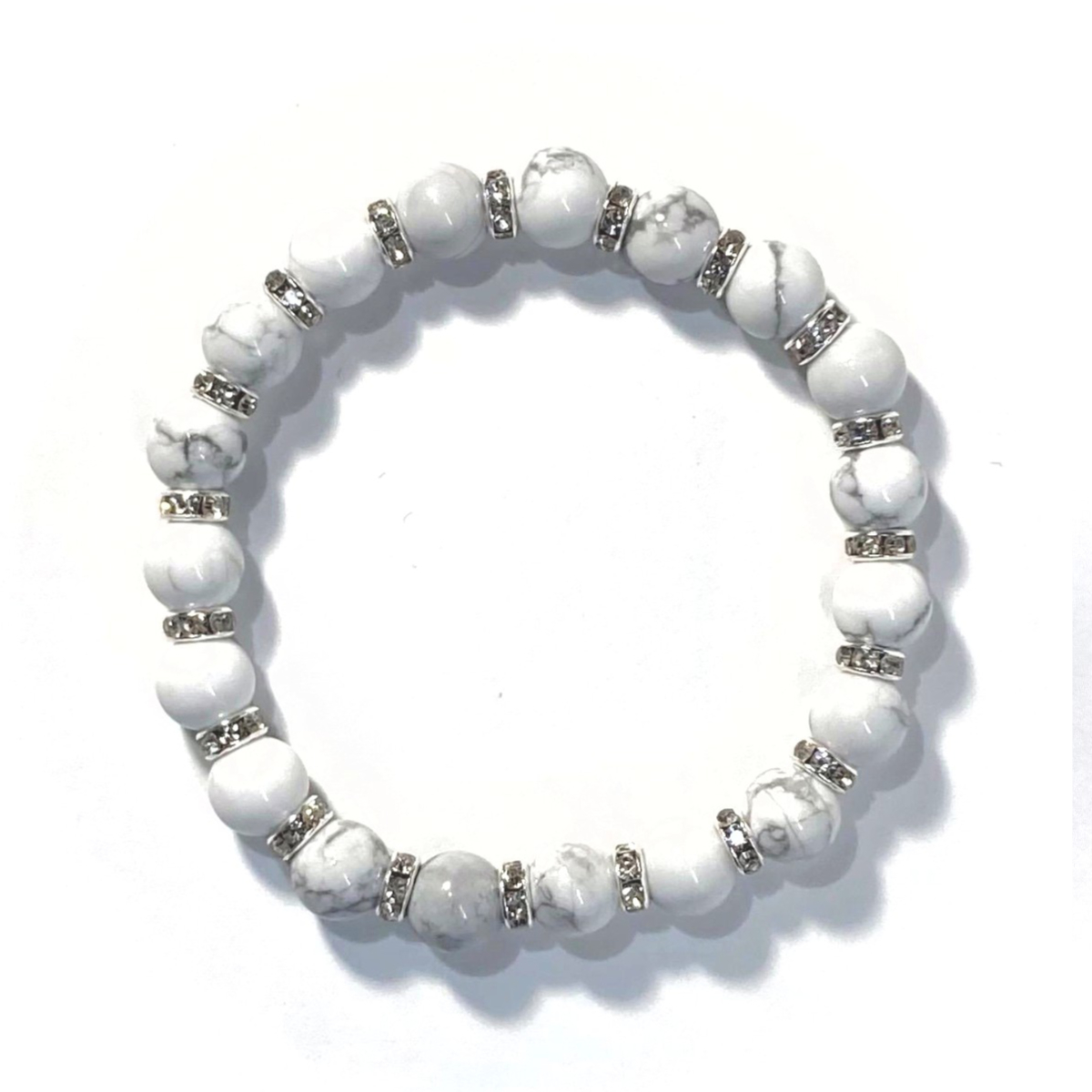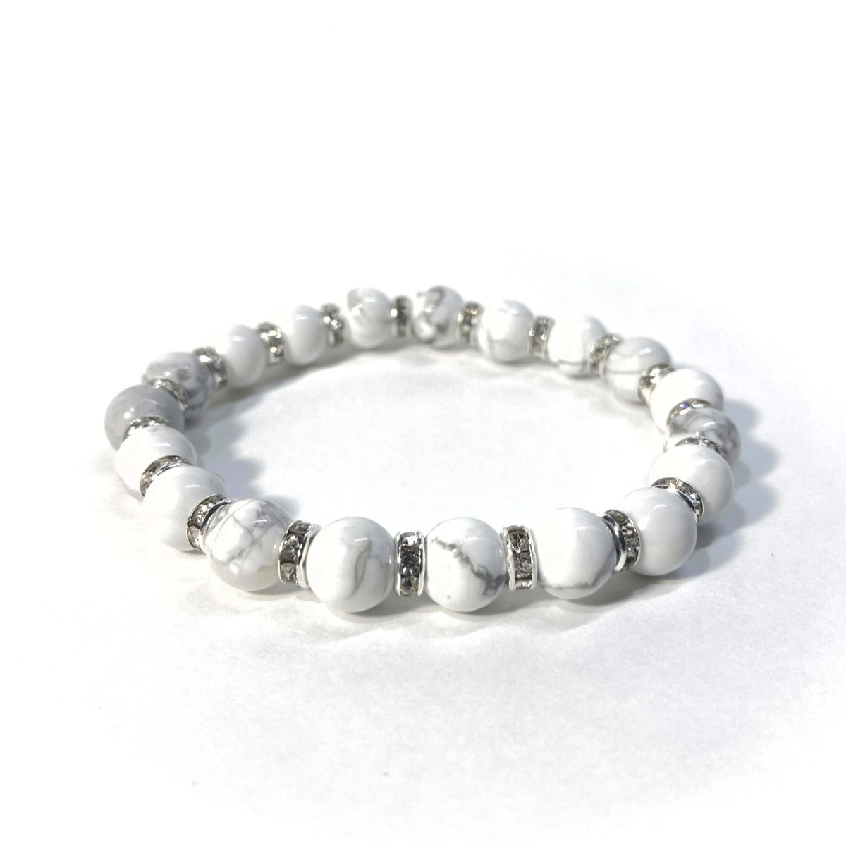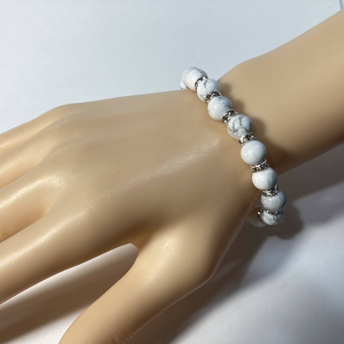こちらは、ハウライトの8mm玉を使用したパワーストーンブレスレットです。石との間にはロンデルを挟み高級感を演出しております。シンプルなデザインは、シーン問わずどんなコーディネートとも合わせ易いブレスレットです。サイズは内径約15cmです。当社の中でも一番人気の実績があるデザインとなっております。気になる方はお早めにどうぞ。
