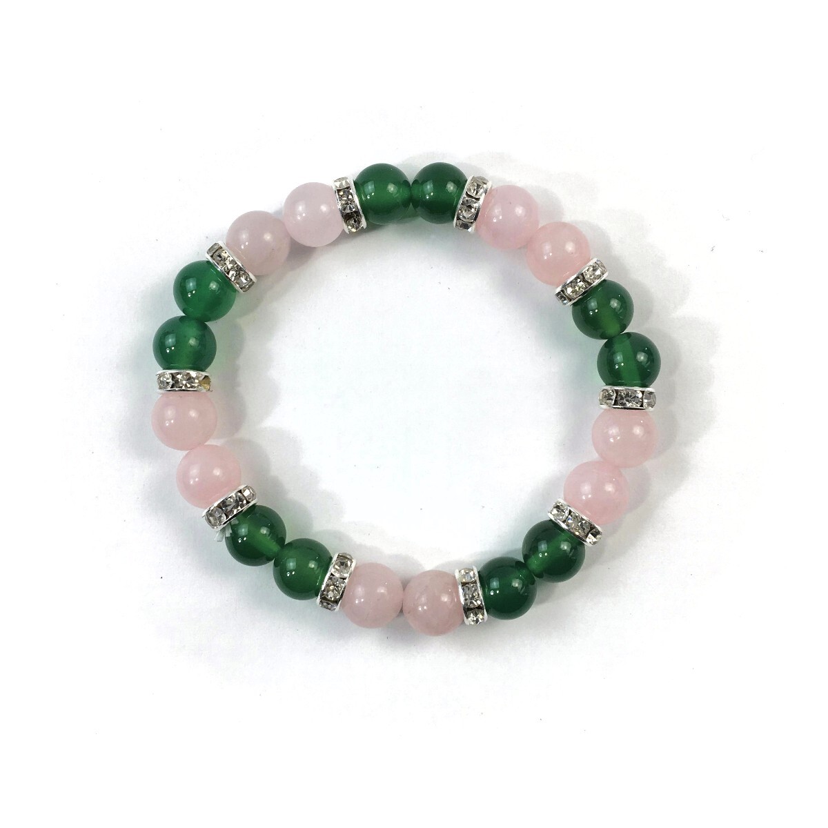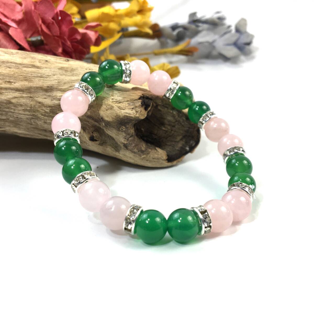 こちらは、8mm玉のローズクォーツと緑瑪瑙 を使ったパワーストーンブレスレットです。シンプルなデザインでどんなコーディネートにも合わせやすいデザインに仕上げています。サイズは内周約15cmです。気になる方は是非この機会にどうぞ。