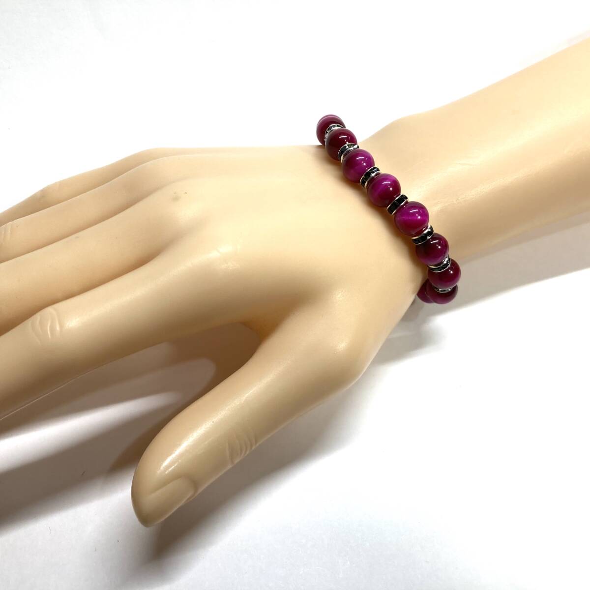 こちらは、ピンクタイガーアイの8mm玉を使用したパワーストーンブレスレットです。石との間にはロンデルを挟み高級感を演出しております。シンプルなデザインは、シーン問わずどんなコーディネートとも合わせ易いブレスレットです。サイズは内径約15cmです。当社の中でも一番人気の実績があるデザインとなっております。気になる方はお早めにどうぞ。