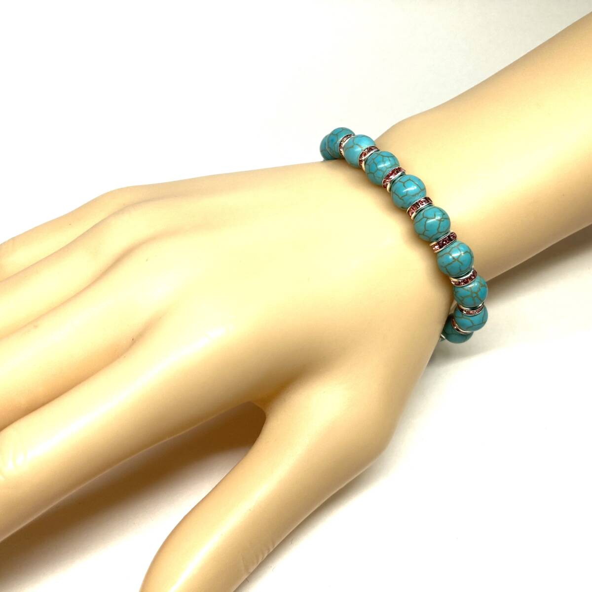こちらは、ターコイズの8mm玉を使用したパワーストーンブレスレットです。石との間にはロンデルを挟み高級感を演出しております。シンプルなデザインは、シーン問わずどんなコーディネートとも合わせ易いブレスレットです。サイズは内径約15cmです。当社の中でも一番人気の実績があるデザインとなっております。気になる方はお早めにどうぞ。