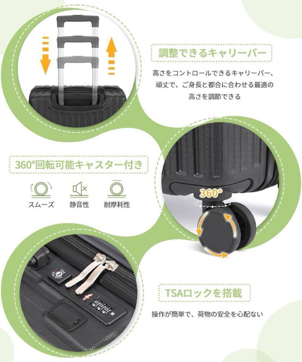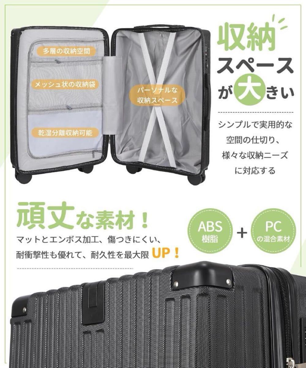 スーツケースはABS樹脂とPC混合材料で製造されており、耐衝撃性が優れています。マットとエンボスにより、キャリーケースのボディが傷つきにくくなります。超軽量で、女性でも楽に持ち運びできますので非常に使いやすいです。