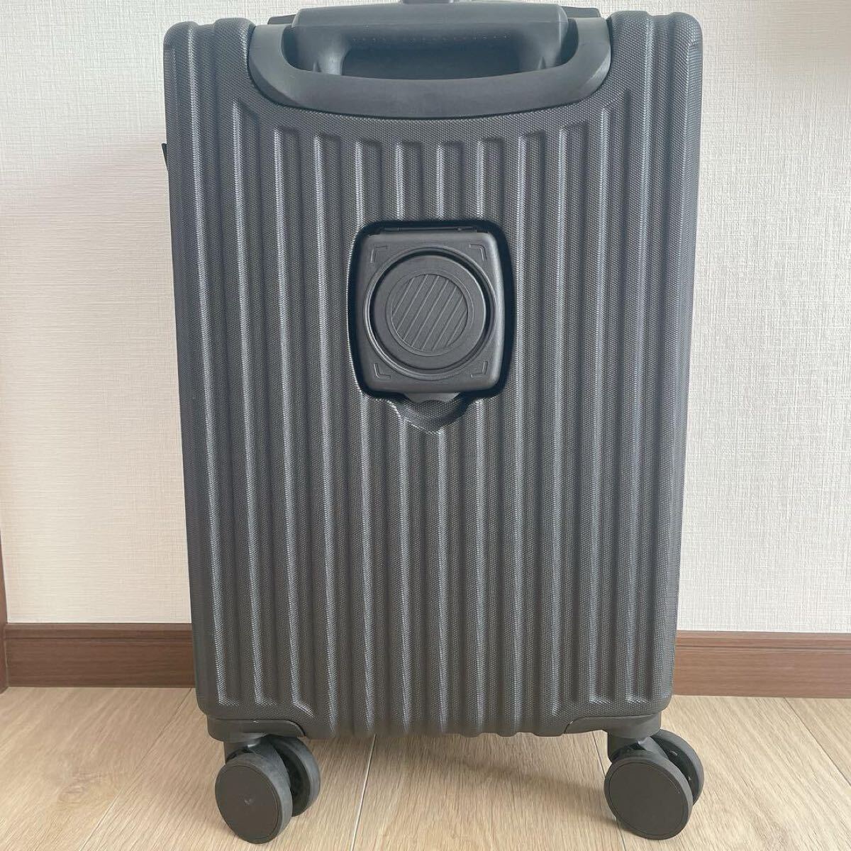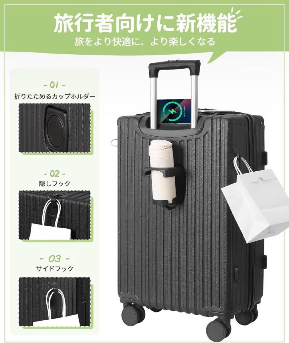 キャリーケースの折りたたみ式のカップホルダーは、コップや傘などを収納できます。またUSBポートが二つ付き、スーツケースを開けなくても、スマホ等の充電可能になります。フックも付いており、軽い小物をぶら下げてきて、両手を解放します。