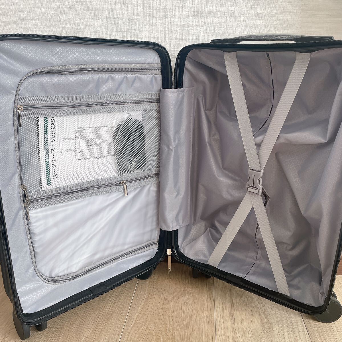 キャリーバッグの内部は高品質のポリエステル生地が採用されます。X型ベルトが完備され、荷物をしっかりと固定し荷崩れを防ぎ、メッシュ状の収納袋は乾湿分離も収納可能で小物の整理にも便利です。