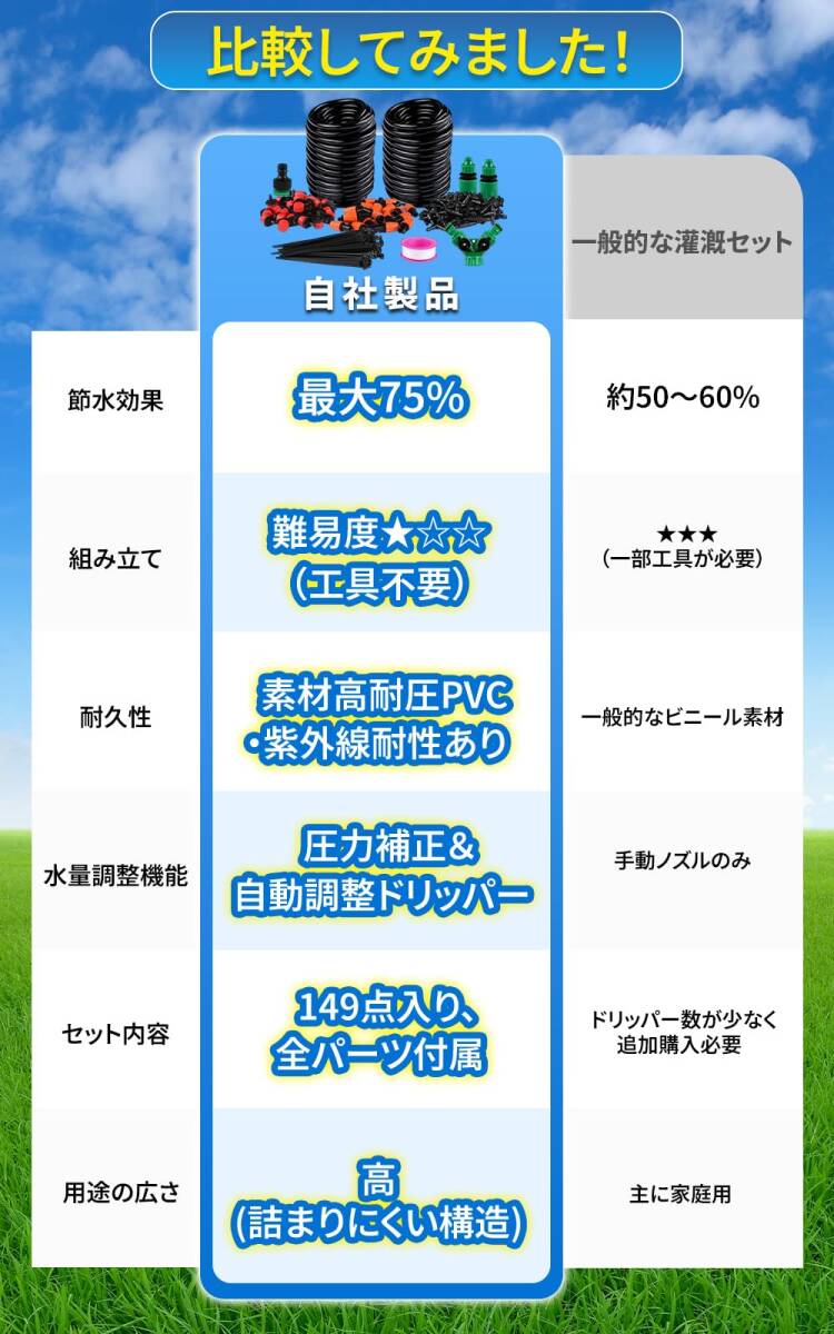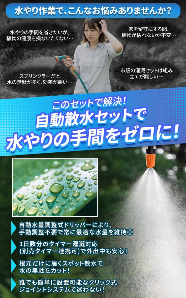 【水の無駄なく、最大70%の節水効果!精密散水システムが植物に適切な水分を供給し、環境にもやさしい節水を実現】精密ドリップ散水システムは、植物の根元にゆっくりと正確に適量の水を供給し、節水に貢献。従来のスプリンクラーより最大70%もの水を節約できます。