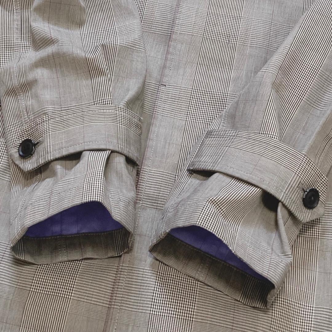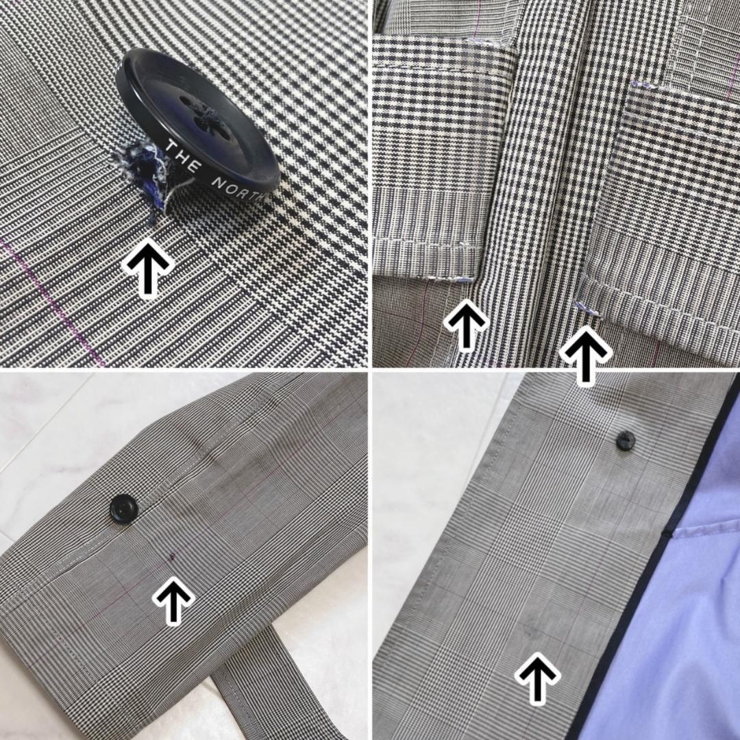 上から2つ目のボタンの生地破れ、袖口ボタンベルトの生地劣化と汚れあり。袖口ボタンと下から2つ目内側のボタン欠品。