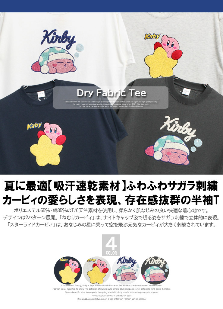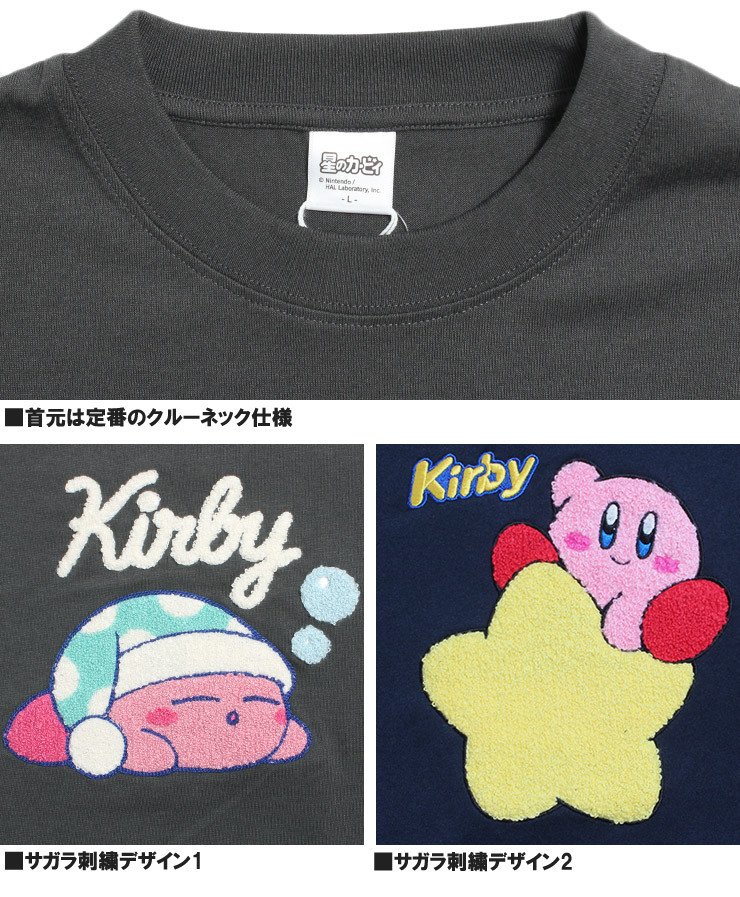 | 商品説明 | ふわふわのサガラ刺繍でカービィの愛らしさを表現した、存在感抜群の半袖Tシャツ。 |