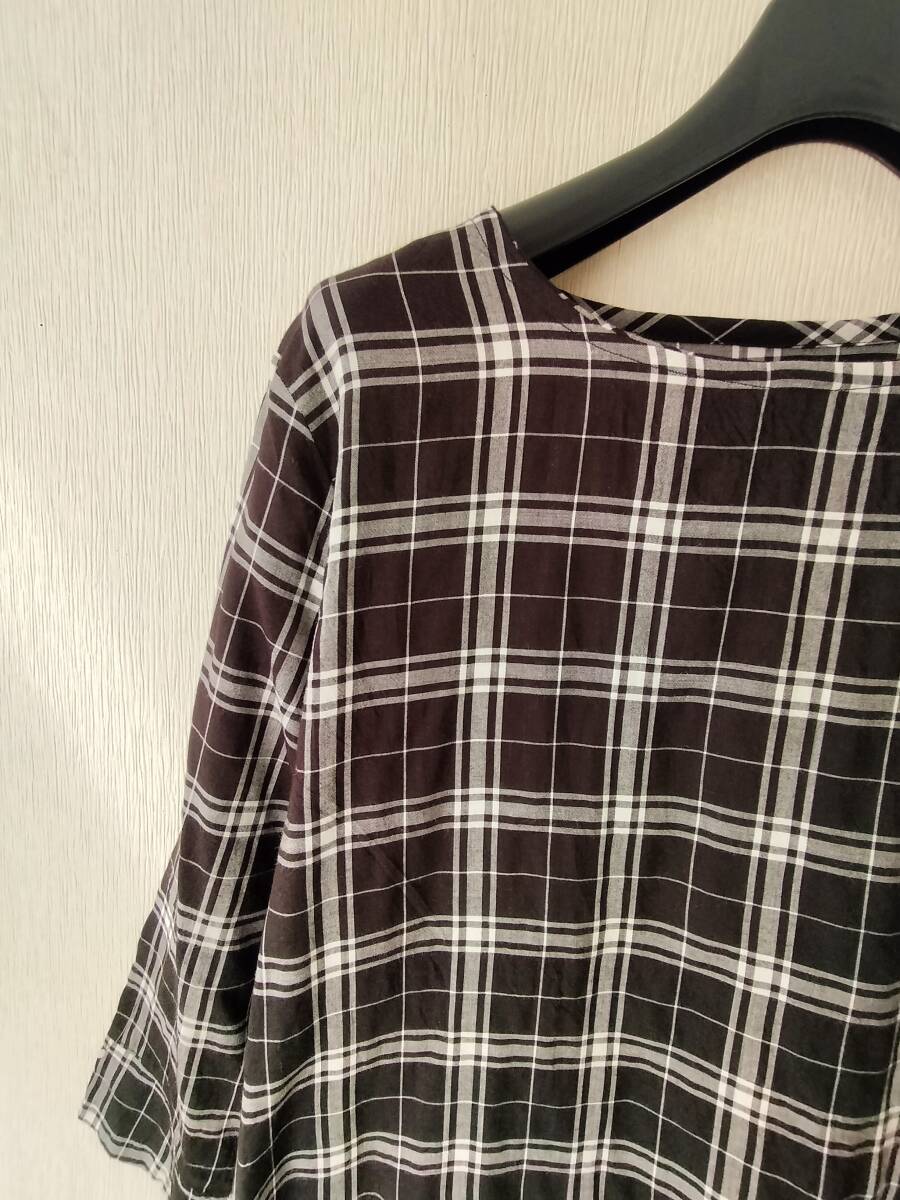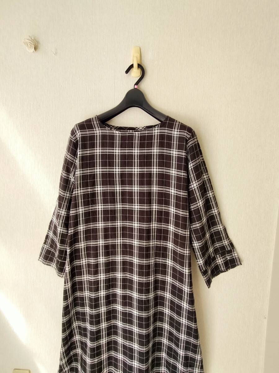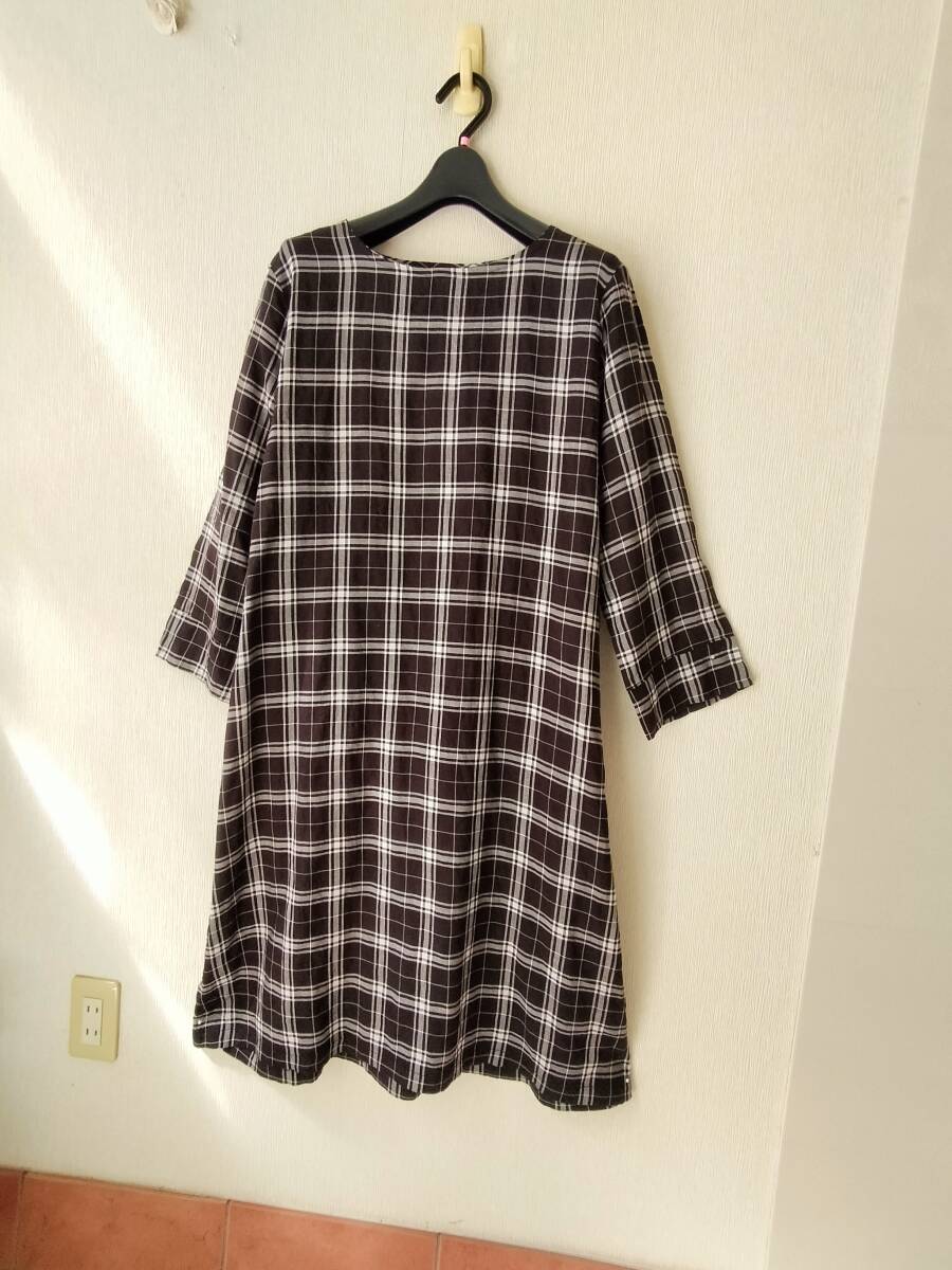 秀ハンド 丈長ワンピ-ス LL位 綿-ヨン混 黒系チェック 袖口カフス 身体の線を拾わない 楽々着用