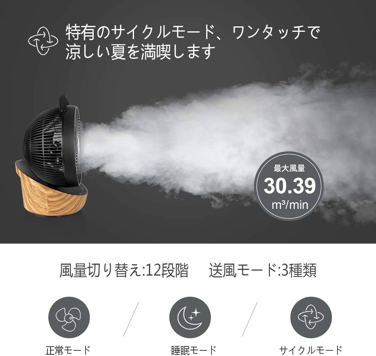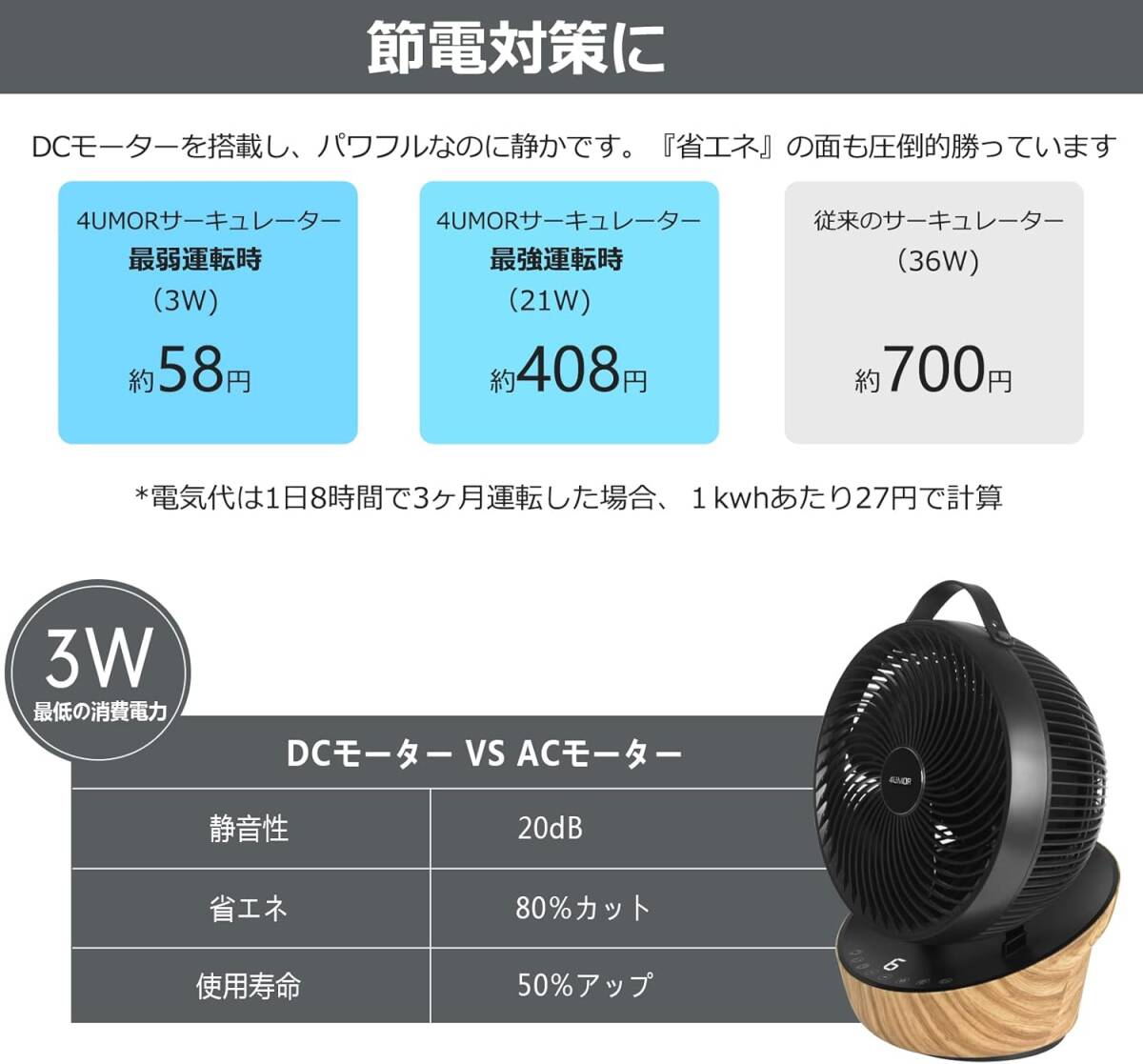 ブラック色 インテリアに馴染む空間デザイン 【節電対策に】4UMOR サーキュレーター DCモーター 扇風機 静音 20畳