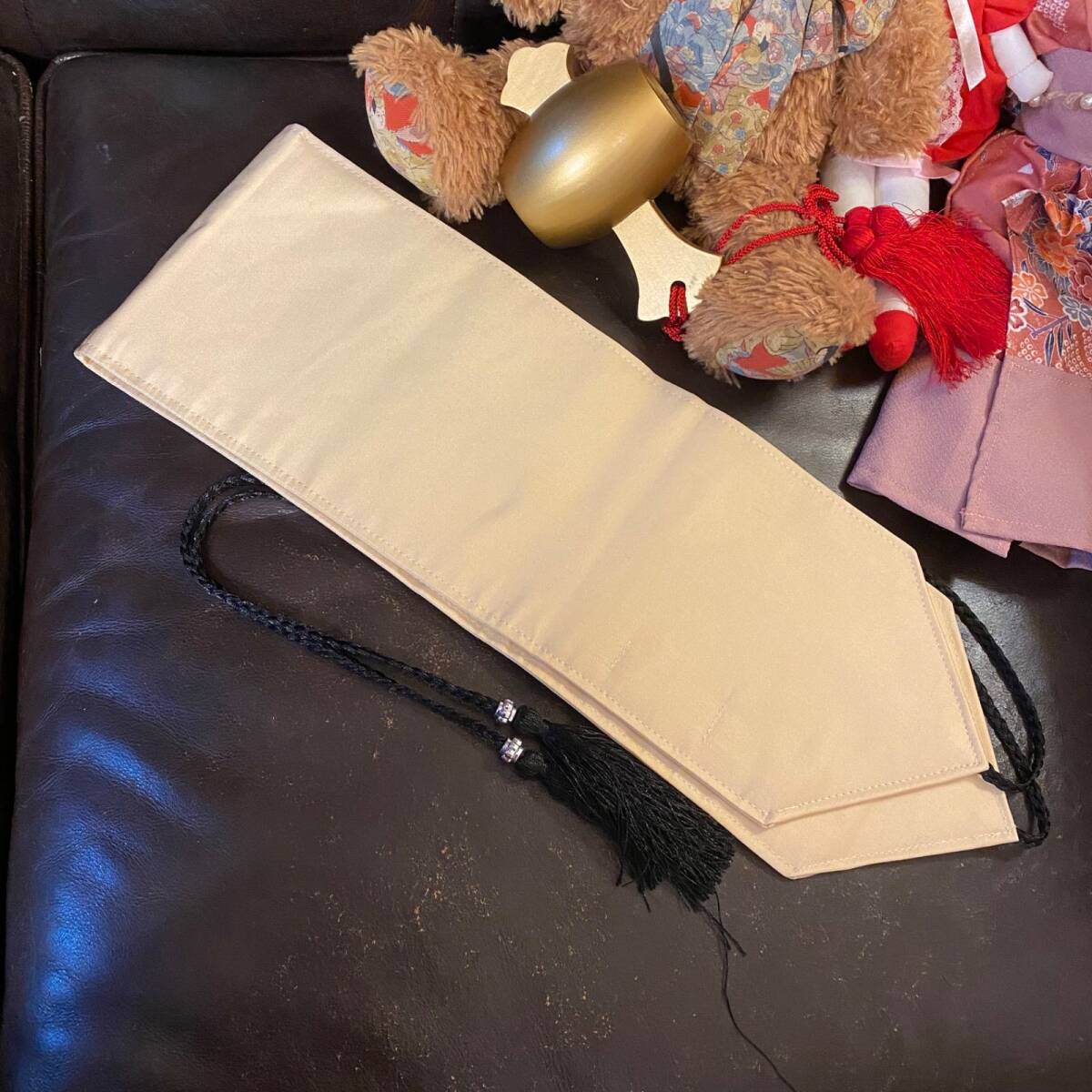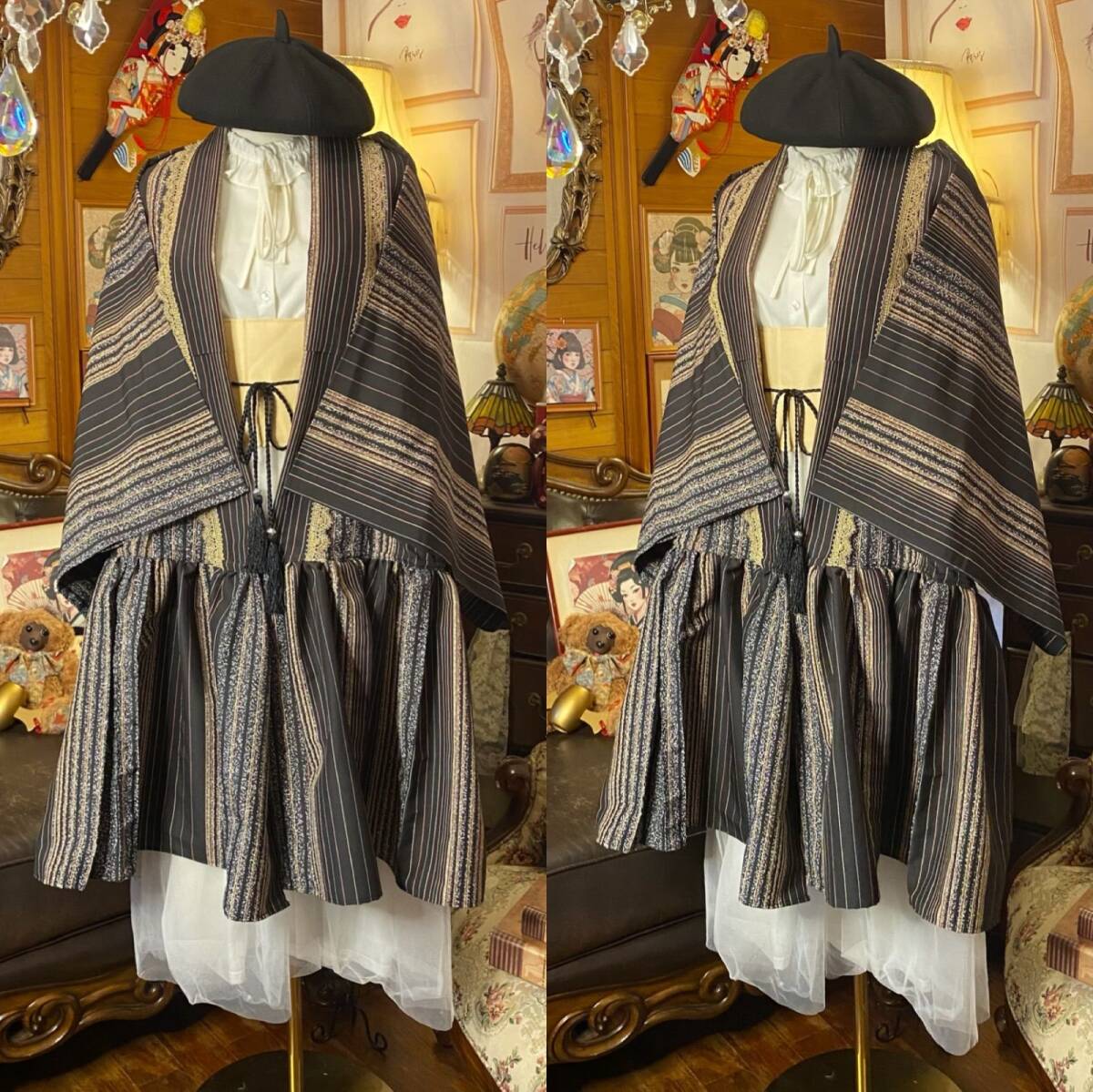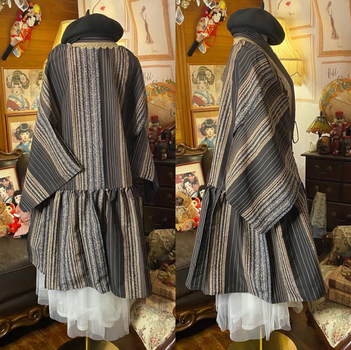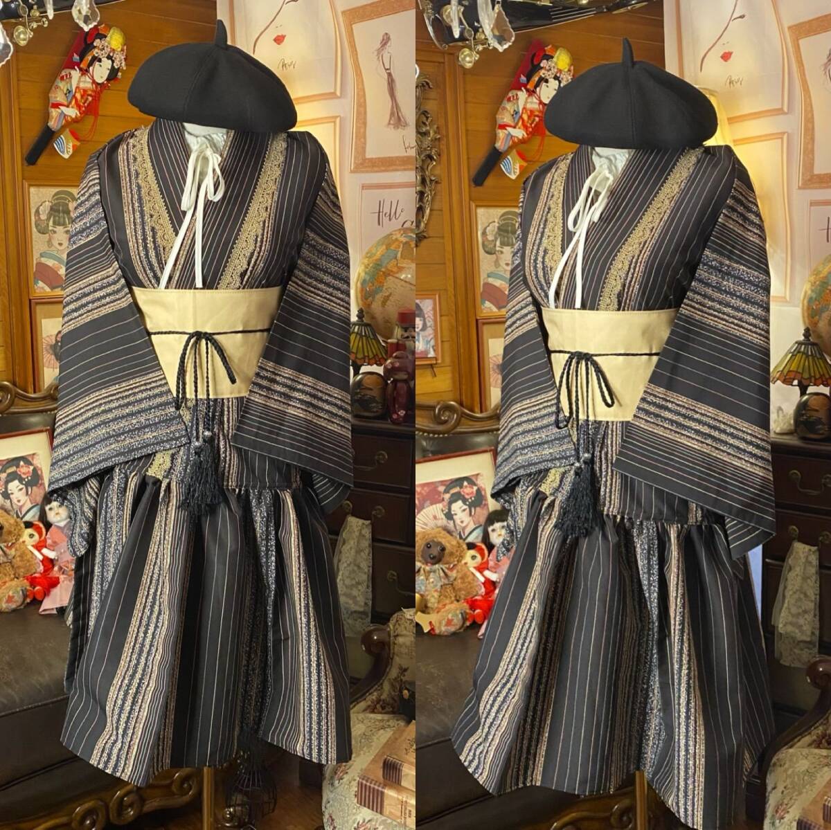 墨黒の地に、霰のような細かな点描と極細の色縞(山吹・翡翠・朱・生成)がリズミカルに走る“粋縞”の着物地を主役に。さらりと艶めくシャンパンベージュの帯ベルト(黒組紐タッセル付き)が全体を引き締めます。ガウンとして羽織れば、抜け感のあるIラインで端正に。ドレスとして帯サッシュベルトをきゅっと結べば、ギャザーがふわりと波立ち、縞が踊る表情に。和とマニッシュが心地よく溶け合う2wayです。