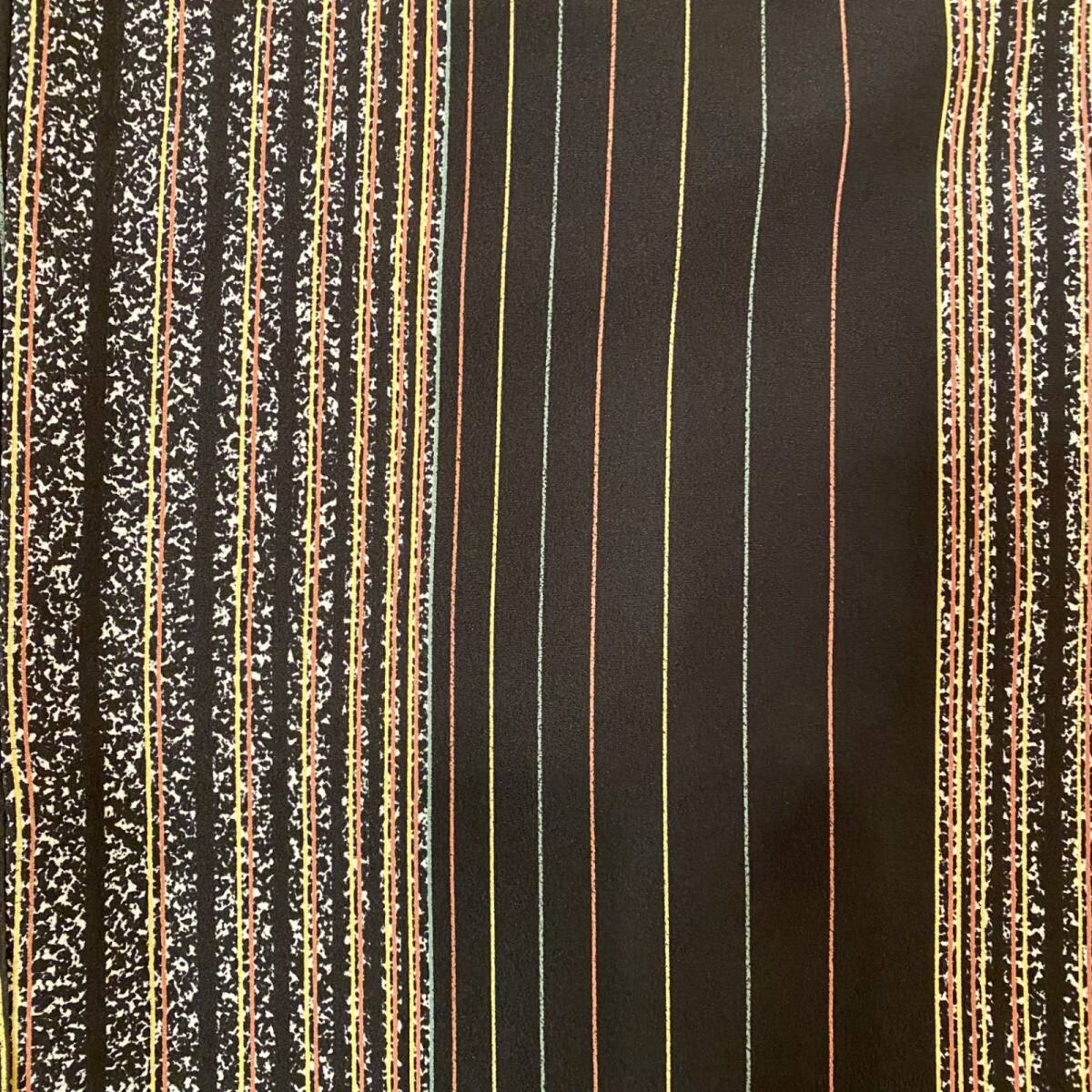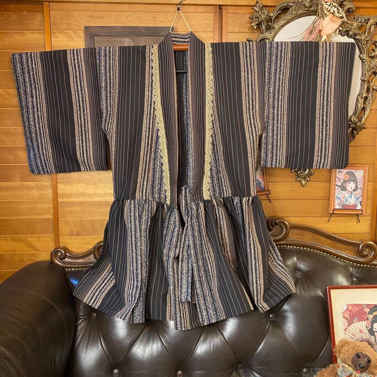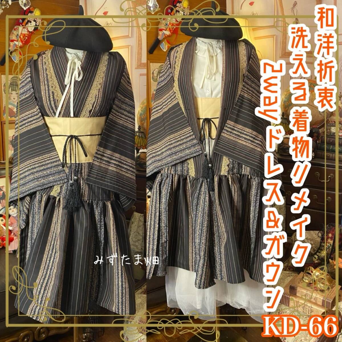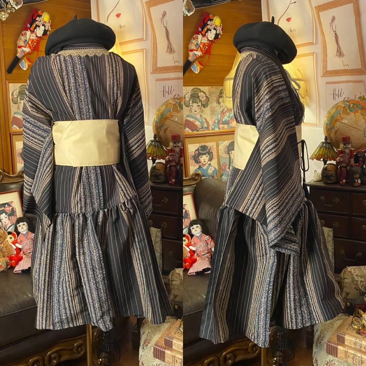 【単衣着物 2way ガウン 羽織り ドレス ワンピース ハンドメイド 和洋折衷 洗える 化繊 リメイク 帯サッシュベルト レトロ 古着 墨黒の地に、霰のような細かな点描と極細の色縞 KD-66】
