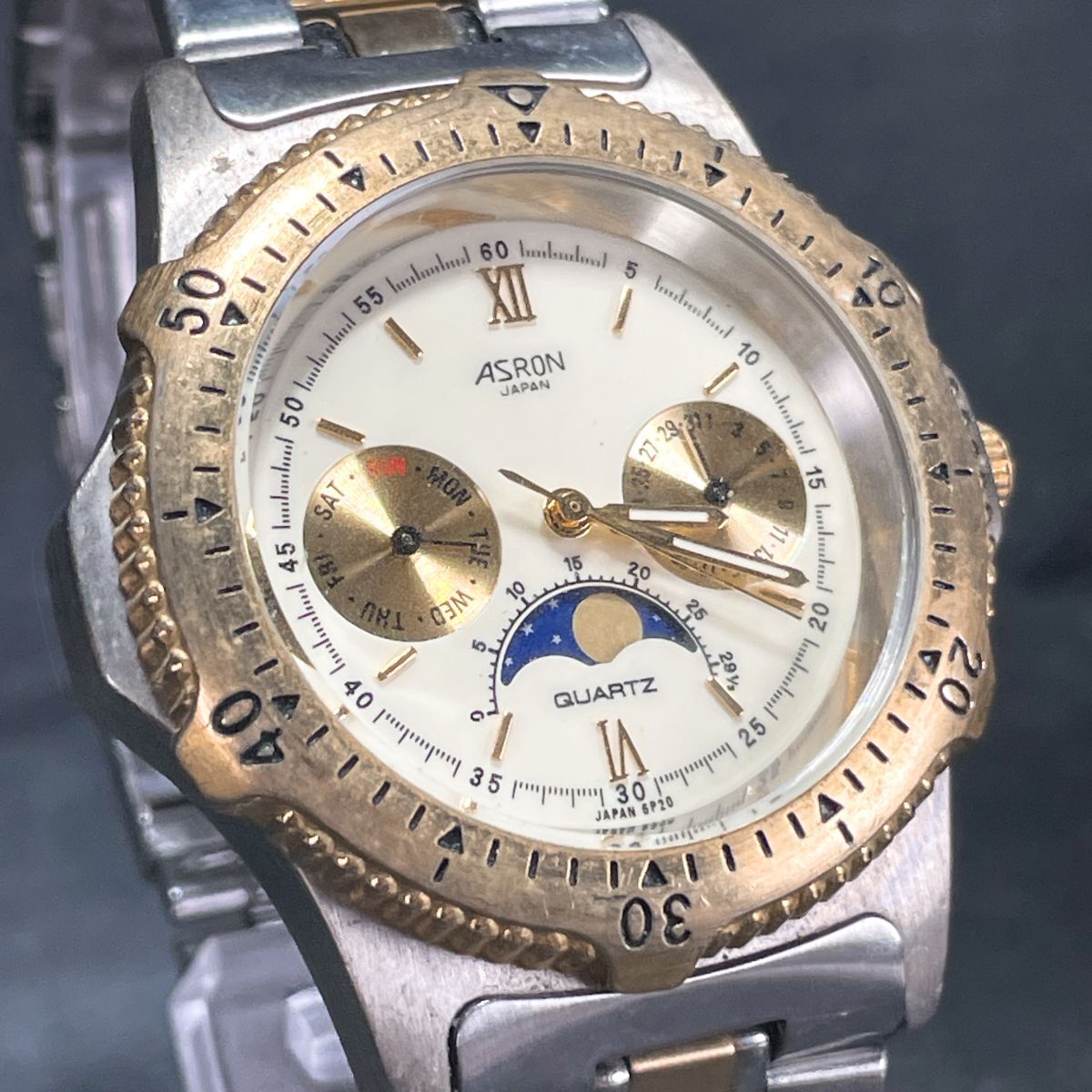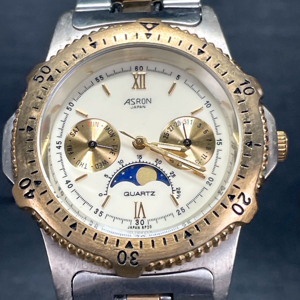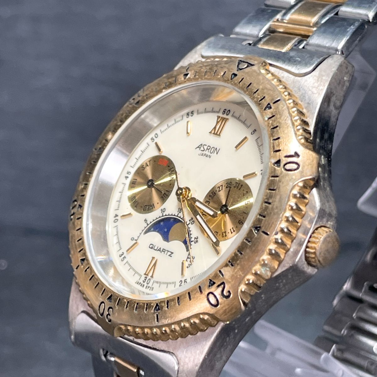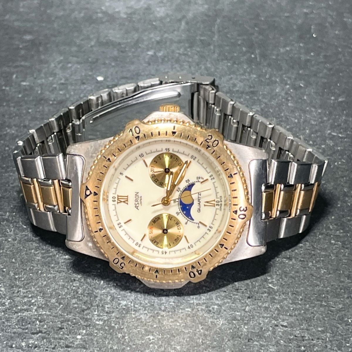 美品 ASRON 腕時計 アナログ クオーツ マルチファンクション ムーンフェイズ メタルバンド シルバー 新品電池交換済み 動作確認済み