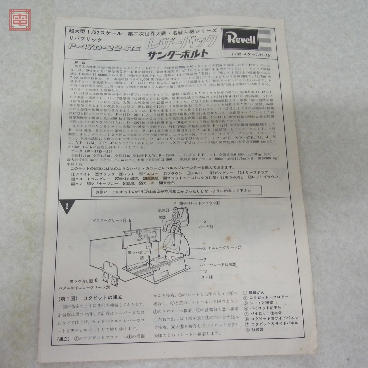 未組立 レベル 1/32 レザーバック サンダーボルト P-47 D-22-RE Revell ■外箱にスレ、イタミ、汚れがあります。 ■パーツにスレ、汚れがあります。 ■説明書に汚れ、黄ばみがあります。 ■デカールに汚れがあります。 ■写真のものが全てです。付属物の有無や状態については写真からご判断ください。 ■付属物については細かいチェックはしておりませんので、万が一、欠品があったり余計な物が入っていたとしてもご了承ください。 ■商品到着後、当店の保証期間中は、商品及び箱や取説、付属品などを1つでも廃棄や破損をしないようにお願い致します。廃棄や破損をした場合、商品に問題があった場合でも対応や返金などの対処ができなくなります。 ■商品によりますが、発売されてから10年以上経過している中古品である事をご理解頂いた上でご入札をお願い致します。なお、新品や美品、また特記事項がある場合は別途明記します。 | |||