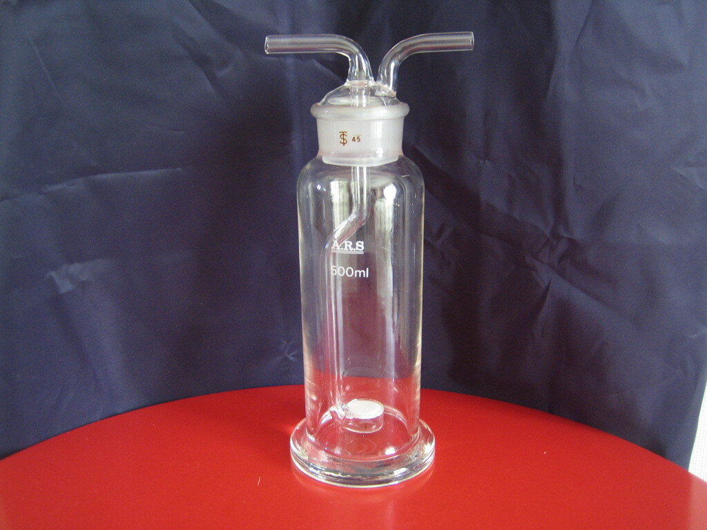 ガラス製の多孔質板フィルター付きガス洗浄瓶 500mLです。
