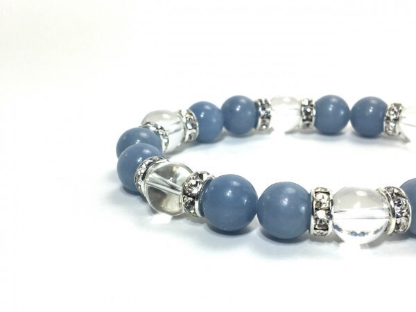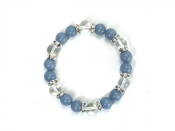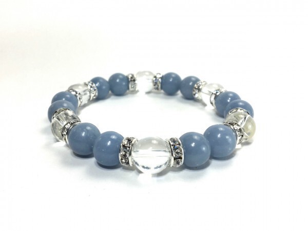 こちらは、エンジェライトと水晶を組み合わせたブレスレットです。間にはロンデルを挟み高級感あるデザインに仕上がっています。石大きさは腕にも馴染みやすいように10mm玉で内径約18cm(伸可能)です。数に限りがございますので気になる方はお早めにどうぞ。サイズ調節も可能ですのでサイズ調節の場合は取引ナビにてご一報くださいませ。(サイズ調節無料です)