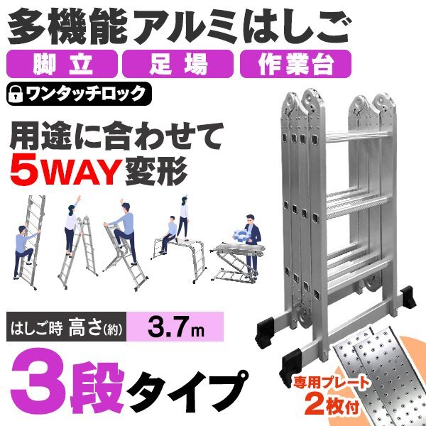 折りたたみ式多機能アルミはしご(専用プレート付き)です。 はしごとして、脚立として、そして作業時の足場としても利用できるマルチなハシゴです。 ◎はしごとして、足場として、脚立として 【商品仕様】 最大高さ:(約)3.7m ※はしご時 重さ:(約)12kg ※本体 耐荷重:(約)150kg 素材:アルミニウム、スチール ※写真と実物は多少異なる場合がございます。あらかじめご了承下さい。 商品コード:A19C370 |