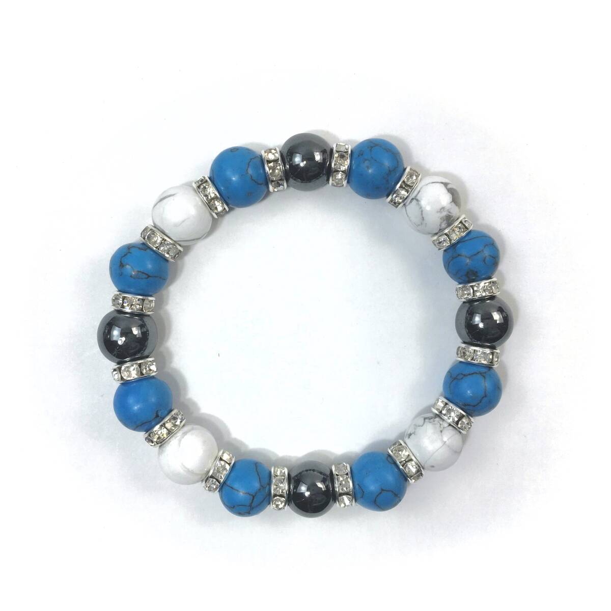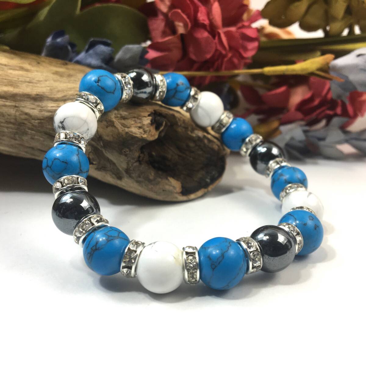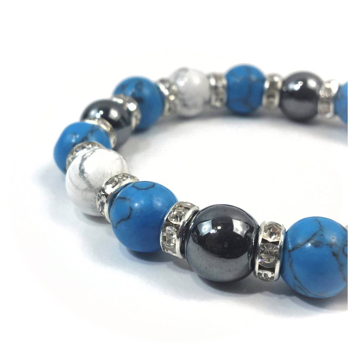こちらは、ヘマタイトとハウライトとターコイズを組み合わせたブレスレットです。間にはロンデルを挟み高級感あるデザインに仕上がっています。石大きさは腕にも馴染みやすいように10mm玉で内径約17cm(伸可能)です。数に限りがございますので気になる方はお早めにどうぞ。サイズ調節も可能ですのでサイズ調節の場合は取引ナビにてご一報くださいませ。(サイズ調節無料です)