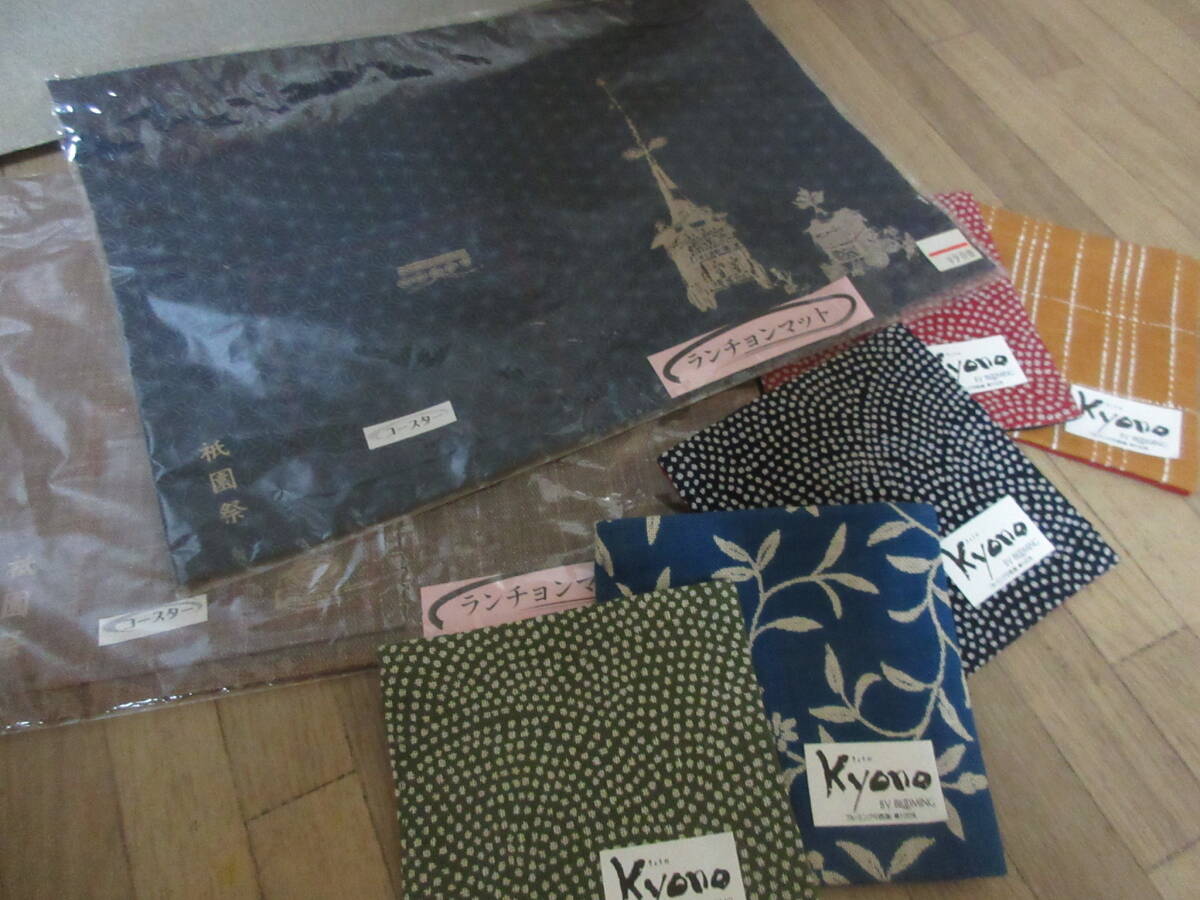 祇園祭のランチョンマット(29㎝×21㎝)2枚、コースターは別のメーカーのものです。約10㎝角のリバーシブルタイプ柄違い5枚セットです。ゆうパケット¥230でお送り予定です。海外の方へのお土産にも喜ばれます。