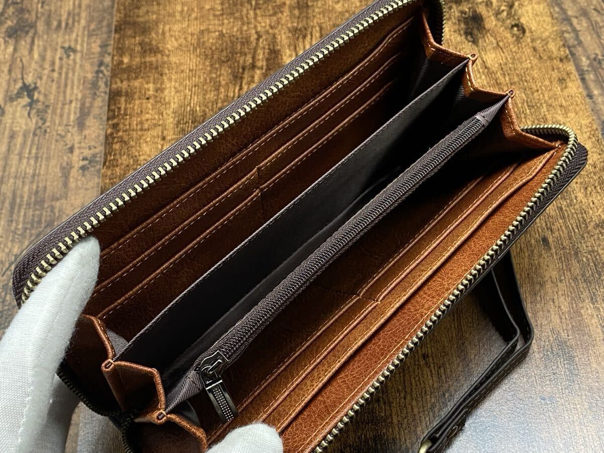 こちらは 新品・未使用の本革長財布 です。上質な牛革を使用し、職人による丁寧な仕上げで、高級感と耐久性を兼ね備えています。ラウンドファスナー仕様で開閉がスムーズ、カードや紙幣、小銭をしっかり収納可能。取り外し可能なハンドストラップ付きで、持ち運びも便利です。メンズ・レディース問わずお使いいただけるデザインです。