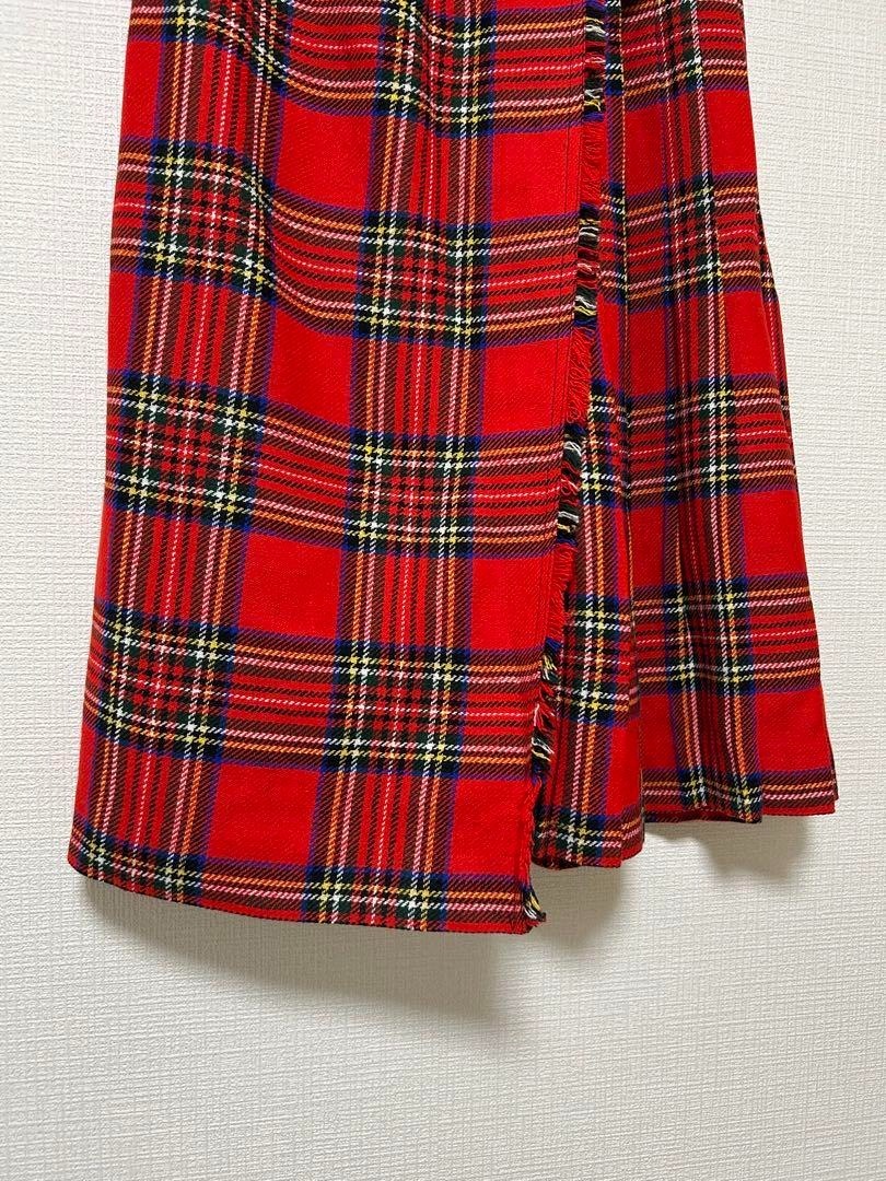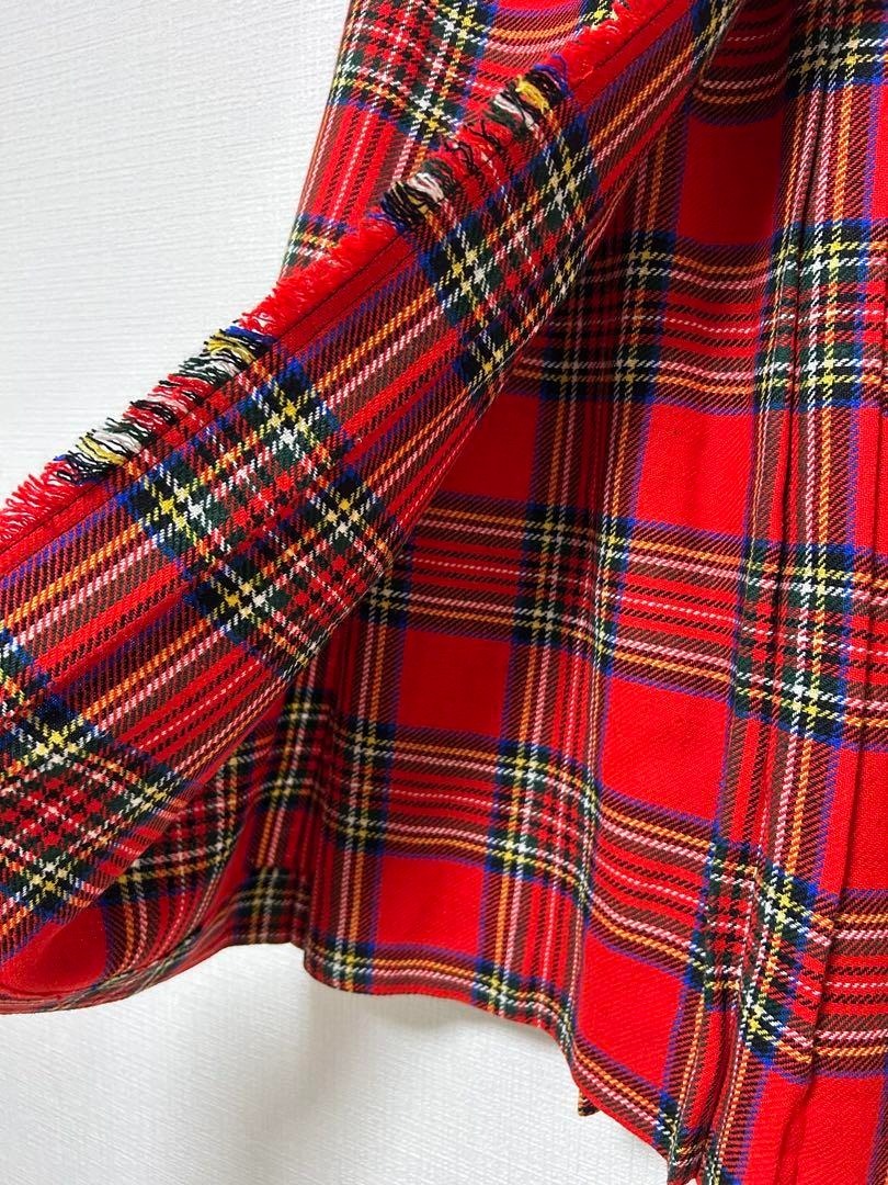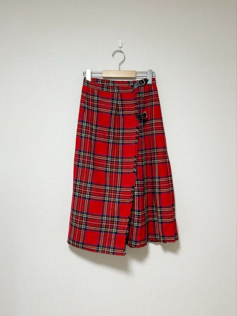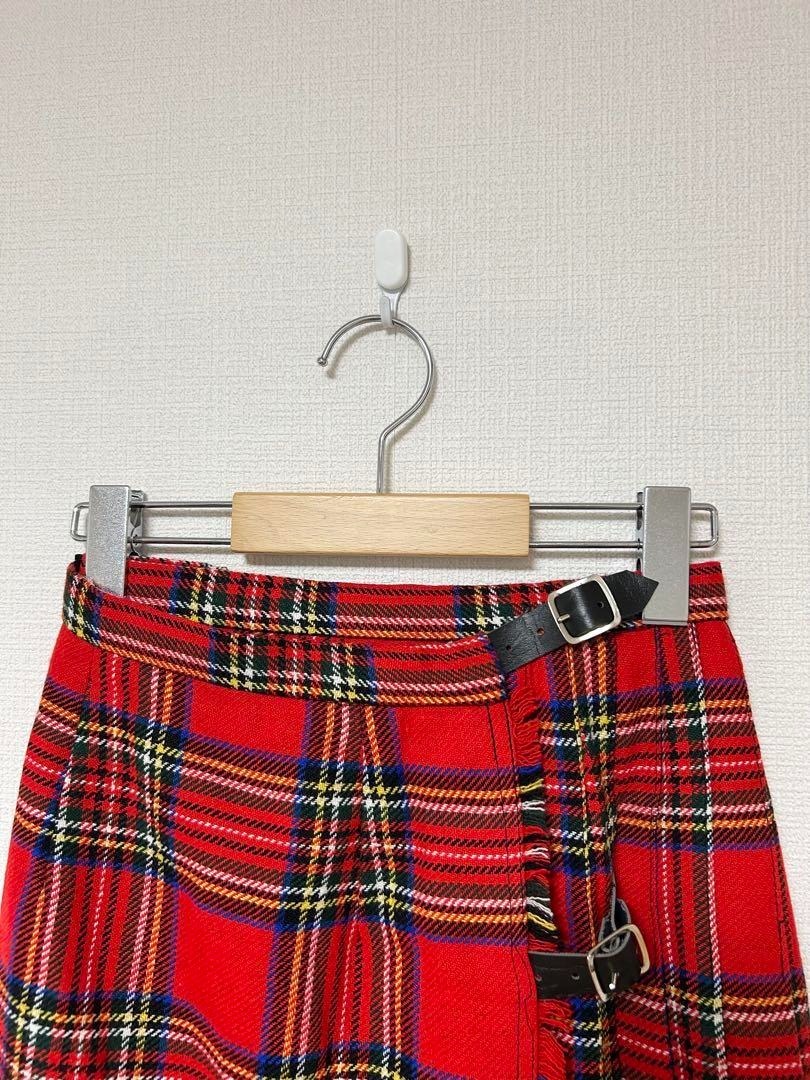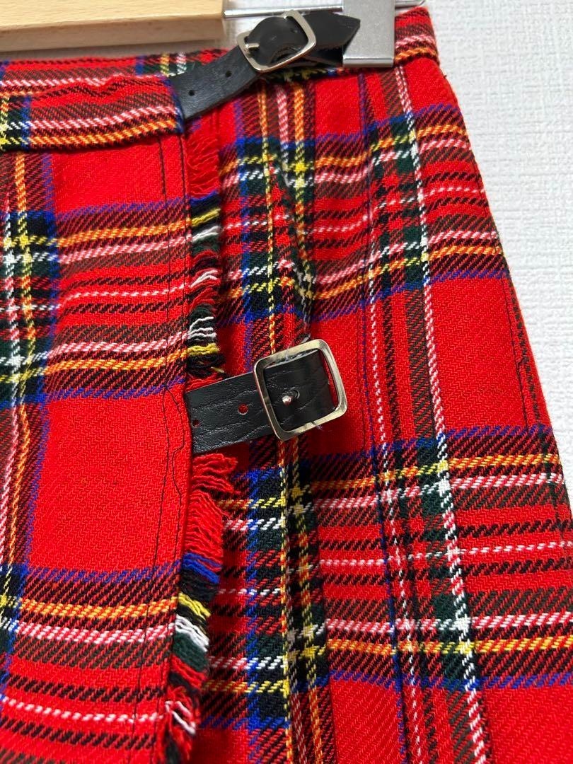 タータンチェック柄、ベルト留めのキルトスカートです。アクリルとウールの混紡生地で乾いた質感の生地です。