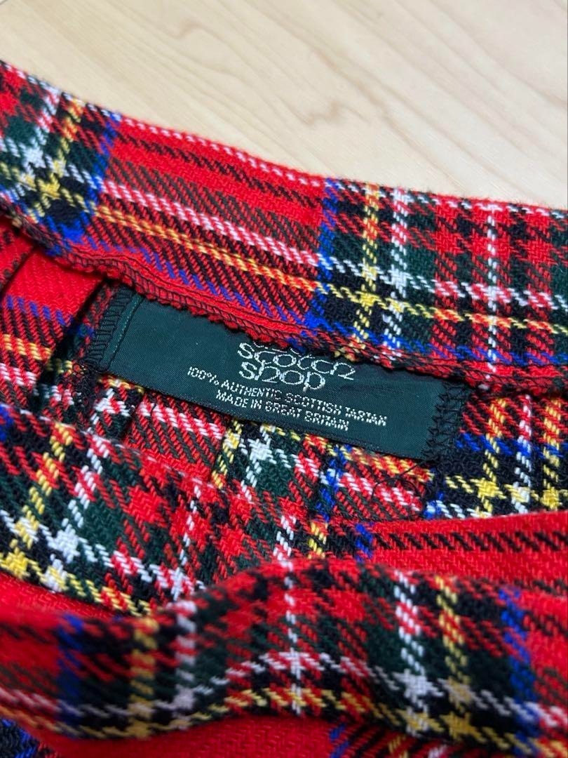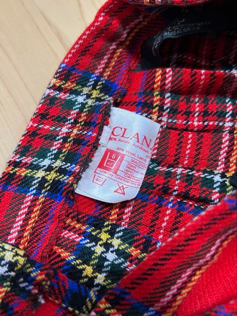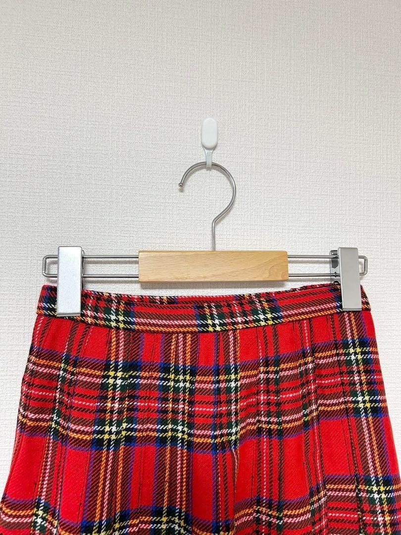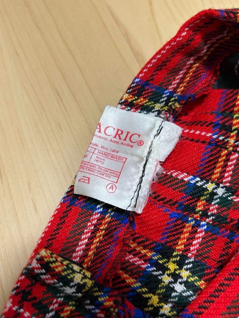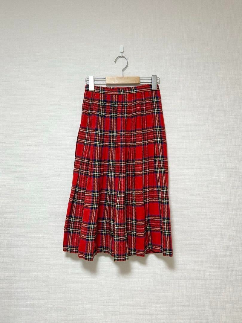 タータンチェック柄、ベルト留めのキルトスカートです。アクリルとウールの混紡生地で乾いた質感の生地です。