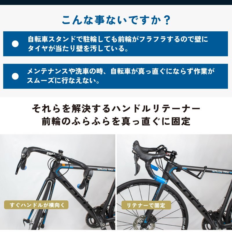 ハンドルと前輪タイヤのぐらつきを防止して真っ直ぐに固定できる便利なハンドルリテーナーです。 前輪がふらふらしないのでメンテナンスや洗車などの作業もストレスなくはかどります。 ハンドルを固定する事で作業性が向上。 後輪固定タイプの自転車スタンドで駐輪の場合にはハンドルが左右に振れてタイヤが壁にこつこつあたって壁を汚してしまう小さいストレスもハンドルを固定する事で解消します。 タイヤを真っ直ぐに出来るので綺麗に駐輪できるのもポイント。 グラつきによるストレスが減り快適に。またタイヤを外した自転車を固定するのに便利です。 装着もうすぐにできて様々なタイプの自転車に対応するので持っておいたら重宝します。 日々使うのも面倒にならない。 [傷つけない] 自転車と接する外側はPVCコーティングでハンドルやトップチューブを傷つけない。 また内側は炭素鋼素材なので強く頑丈で折れたり割れたりしない。 [ゴムバンドでロック] ゴムバンドで自転車とハンドルリテナーを固定します。 ゴムバンドは前後にスライド可能で自転車に合わせて調整できる。 [用途] メンテナンスや修理、整備や自転車保管、輸送時、自転車駐輪のサポートに。 ハンドルやフロント回りが動かない用に固定できる。 [適用自転車] ハンドル径最大径32mm、トップチューブ最大径50mmに対応。 だいたいの自転車にお使い頂けます。 商品内容ハンドルリテーナー サイズ長さ380x幅110/160mm、外径φ9mm 重量約350g 材質炭素鋼本体(径φ6mm)、表面PVCコーティング(厚み約3mm) 適用車種ハンドル径最大φ32mmやトップチューブ最大φ50mmにも対応し、ほとんどのロードバイクとMTBに使用可能です。 ・ディスプレイ環境により実物と色が異なる場合が有ります。 ・入荷時期により予告無く一部仕様変更する場合が有ります。 ・表記サイズは商品の伸びの無い寸法計測数値です。 |
