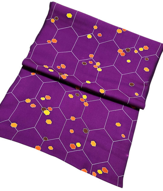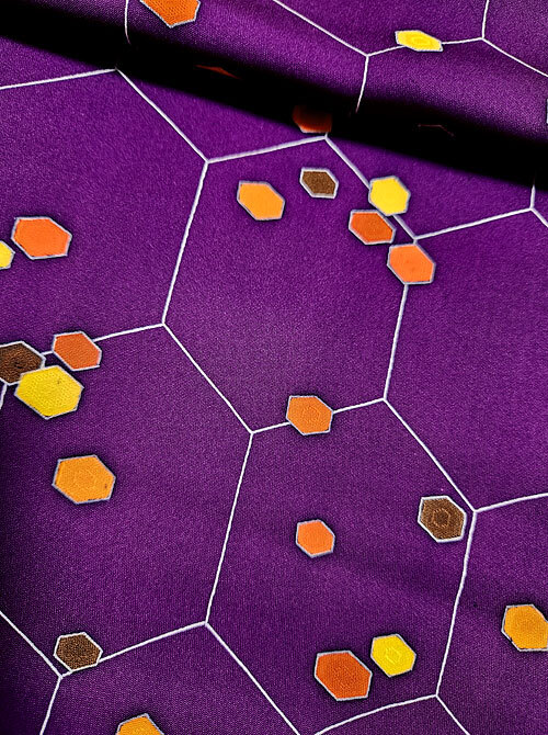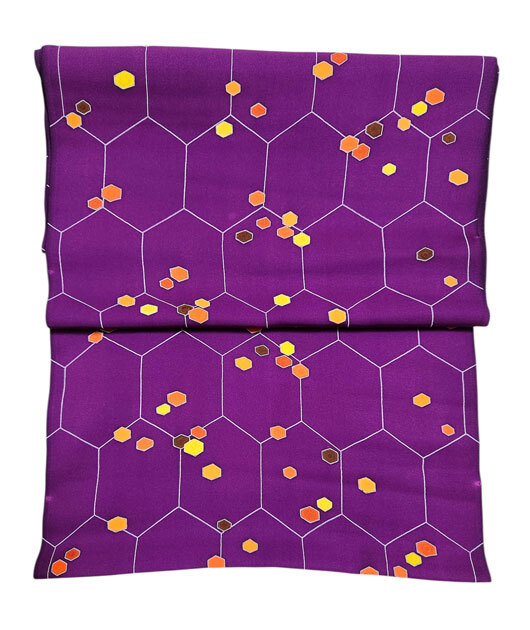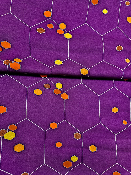 つるっとした生地に花紫色地、亀甲文様にカラフルな六角形が散っています。