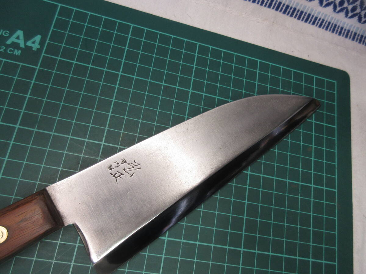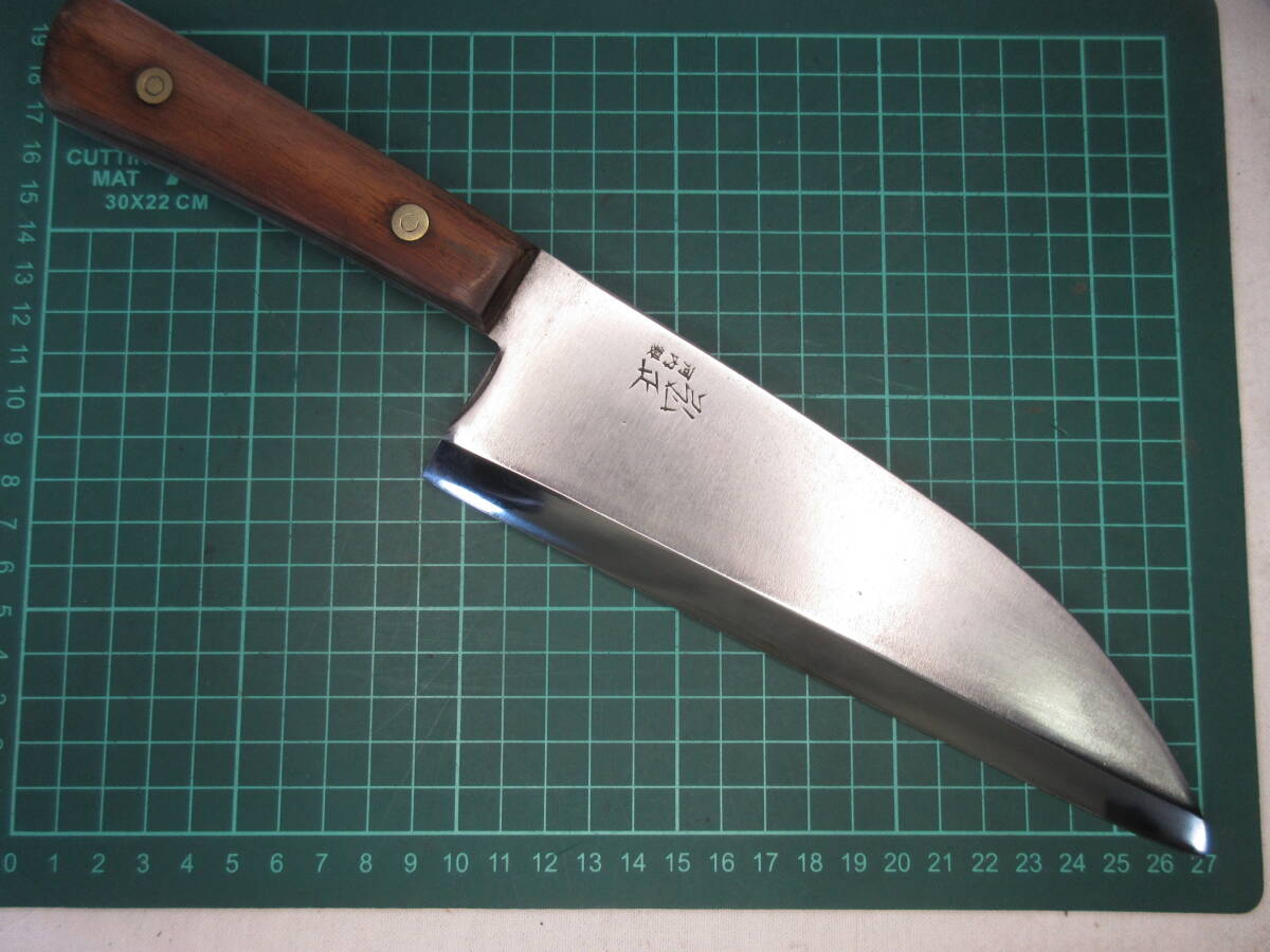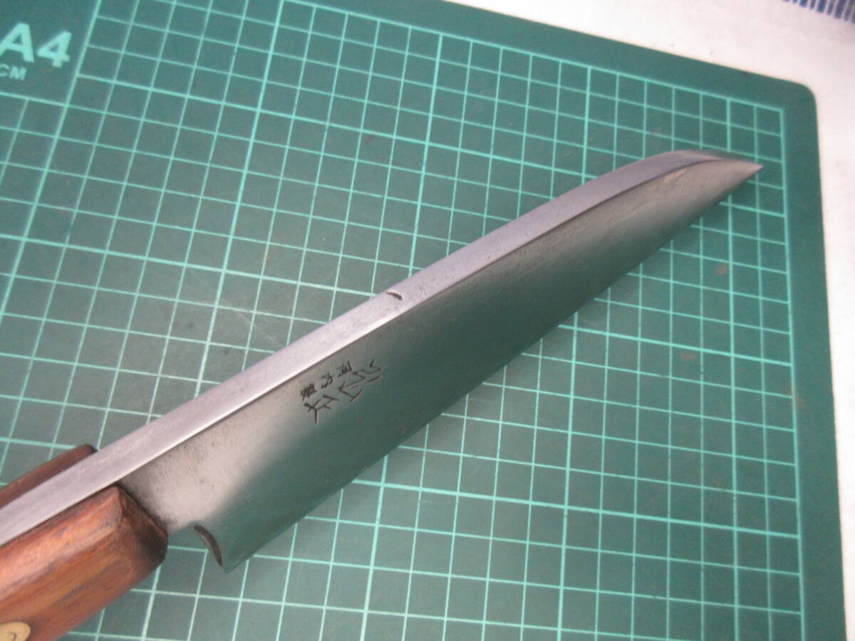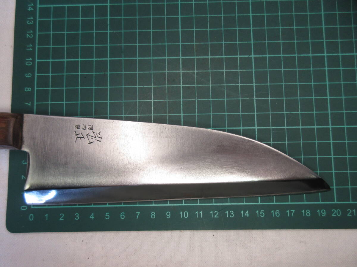 「受取連絡」が出来ない方の入札はお断りします。 こちらから評価を入れることはありません。 ■■■■■■■■■■■■■■■■■■■■■■■■■■■■■■■■■ 洋出刃20cm 片刃 刃が鉈のように鈍角です、細かい作業は難しいと思います。骨切り? 全鋼で直ぐ錆びます。(恐らく中子まで全て鋼です。) 峰厚で600gと重いです。裏すきは無くフラットです。 癖のある特殊包丁です。 最後の写真は磨き前です。 歪みや反り、落としきれない錆があります。全体的に使用感があります。 包丁のみの出品です、付属品はありません。 ■■■■■■■■■■■■■■■■■■■■■■■■■■■■■■■■■ 発送は着払いゆうパック60サイズです。 以下は定型文です。 洋包丁は両刃、和包丁は片刃を前提に出品しています。 (タイトルと個別情報に刃付けの記載が無ければ上記のとおりです) 他の出品物と同梱できます。(システム上、着払いとのまとめ依頼ができません。落札後に同梱希望のメッセージを 頂ければ対応します。) 送料と材質についての質問には返答しません。 包丁につきましては全てジャンクとし、ノークレームノーリターンでお願いします。 出品からお品物が届くまでに時間が掛かった場合、鋼などの材質ですと変色や錆などの変質がある場合がございますのでご了承ください。 錆の酷い包丁は再生研磨していますが、あくまで素人仕事です。電動工具を用いての仕上げです。 削る、磨くは出来ますが歪みの修正は出来ません。中古品ですので歪みがある前提で入札してください。 磨きにより錆に強くなるメリットがありますが切った食材が張り付くデメリットがあります。 切れ味が悪いや、思ったより汚いなどのクレームはご遠慮ください。 触れば怪我をするほどの最低限の刃付けはしてあります、開封時にご注意ください。 肉眼での検品ですので微細な傷や欠けを見落としている可能性もありますので写真を参照してください。 現状維持のために防錆に椿油を塗布していることがありますので写真に不自然な艶が写っている時があります、ご了承ください。 (鋼の洋包丁の場合は中子にも塗布するために柄にも油が散布しています。ご使用前に洗浄してください。) 中子やリベットの錆を落とす為に柄ごと研磨する場合がありますので、柄に研磨痕が残っている時があります。 柄の仕上げに軽く蝋引きしています。 片刃の場合、研ぎですが砥石傷が付くのを嫌ってベタ研ぎはせず、峰をわずかに浮かして仕上げています。(綺麗な裏押しの和包丁はベタ研ぎです) 10対0ではなく9対1位の感覚です、完璧な片刃をお求めの方は入札をご遠慮ください。 (和包丁は片刃前提です、洋包丁が片刃の場合にはタイトルと個別情報に片刃と記載してあります) 有効利用、再生利用できる方の入札をおまちしています。 写真で判断いただき、商品説明を理解出来る方のみ入札をお願いします。 クリーニングなどはせず、写真のままお送りします。 専門知識が乏しい為、質問に答えられない時があります。 ブランド品の真偽については不明とさせて頂きます。 素人による中古出品です、すり替え防止の為にもノークレームノーリターンでお願いします。 入金を確認しました時点でお取り置き終了と判断し発送準備にはいります。 同梱発送、お取り置きを希望の方は入金前に連絡頂くと助かります。 落札後、48時間以内の初回連絡、五日以内の入金が確認出来ません場合は落札者様都合のキャンセルとさせて頂きます。 その場合落札者様に非常に悪い評価とブラックリストへの登録を同時に行いますのでご了承ください。 (以後こちらのオークションに入札が出来なくなります) #お取引に不安を感じる評価の方は削除させて頂く事があります。 #総合評価が高くても直近に悪い評価がある方も削除致します。 #いたずら入札を防ぐ為、1万円以上の入札額時の場合は新規の方の入札をお断りします。 #(どうしても入札したい時は質問欄より入札意思をお伝えください。) *評価を入れて頂くと反射的にお返しする形を取っています、不要の方は評価を入れないで下さい。 *こちらから評価をお付けすることはありません、不要の方は「受取連絡」で終了して下さい。 自己紹介欄もあわせてお読みください。 | ||