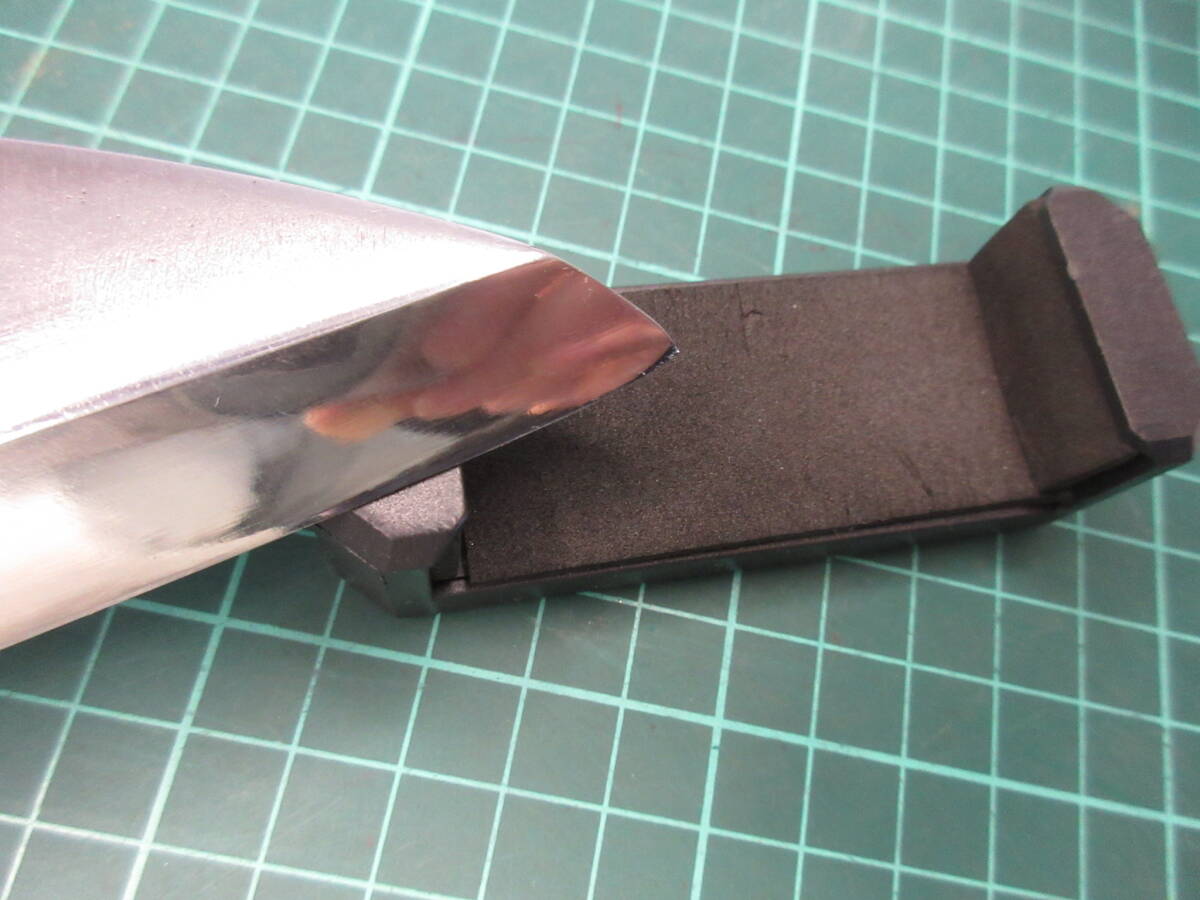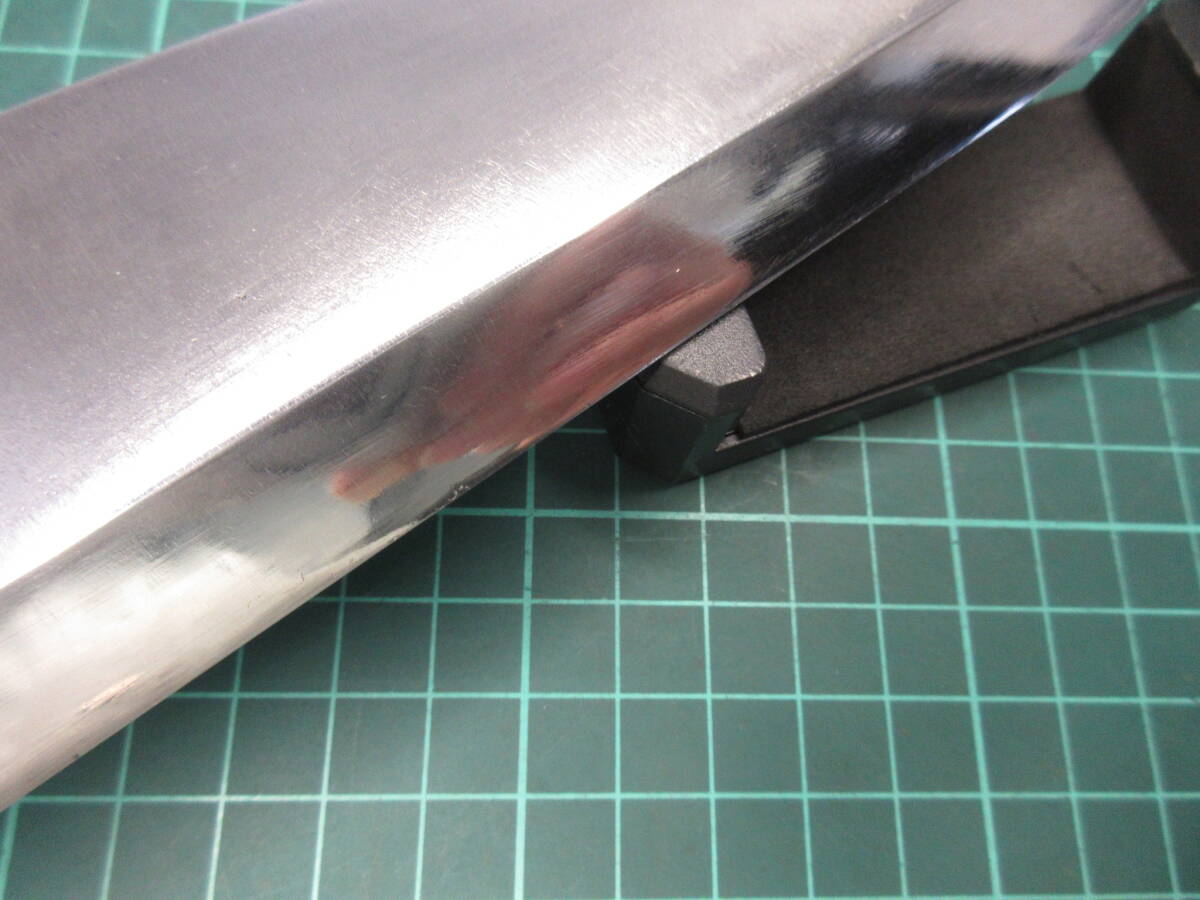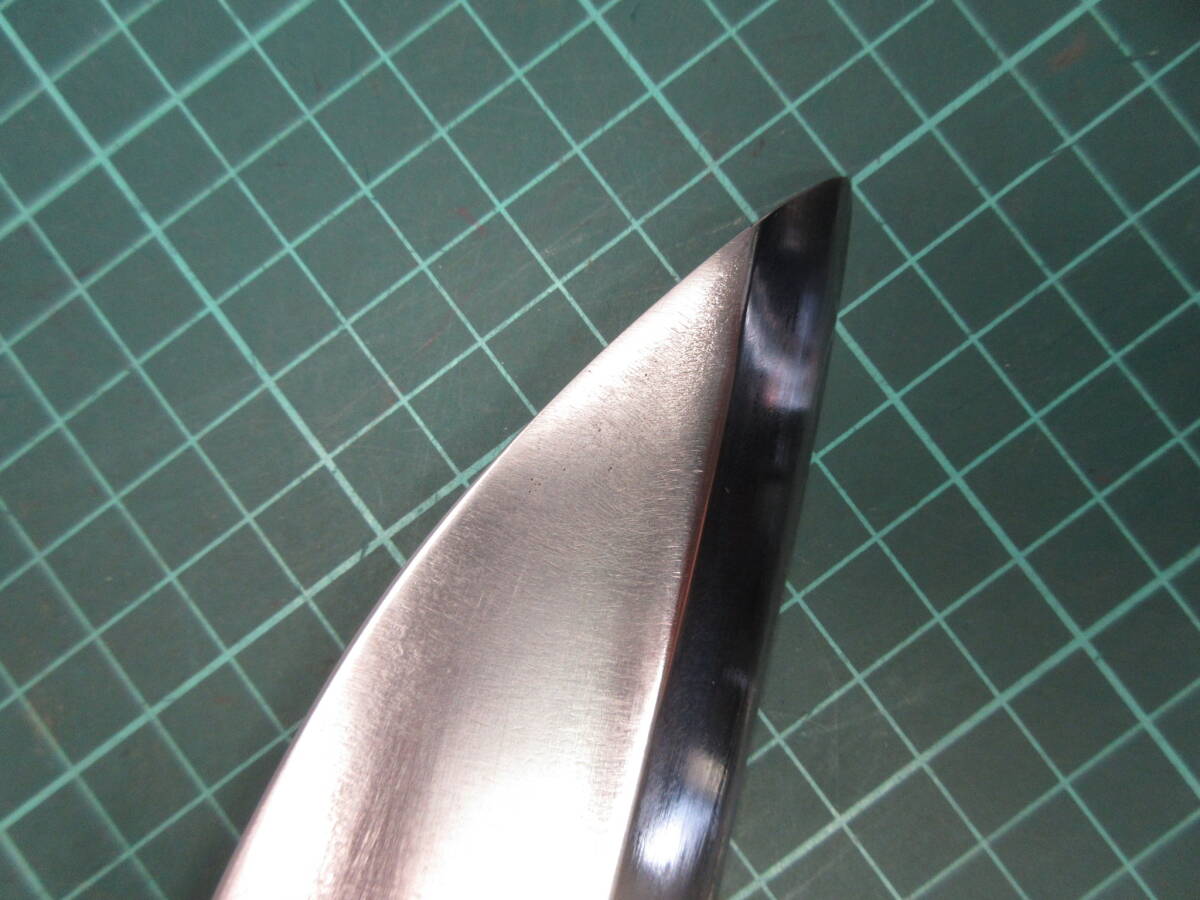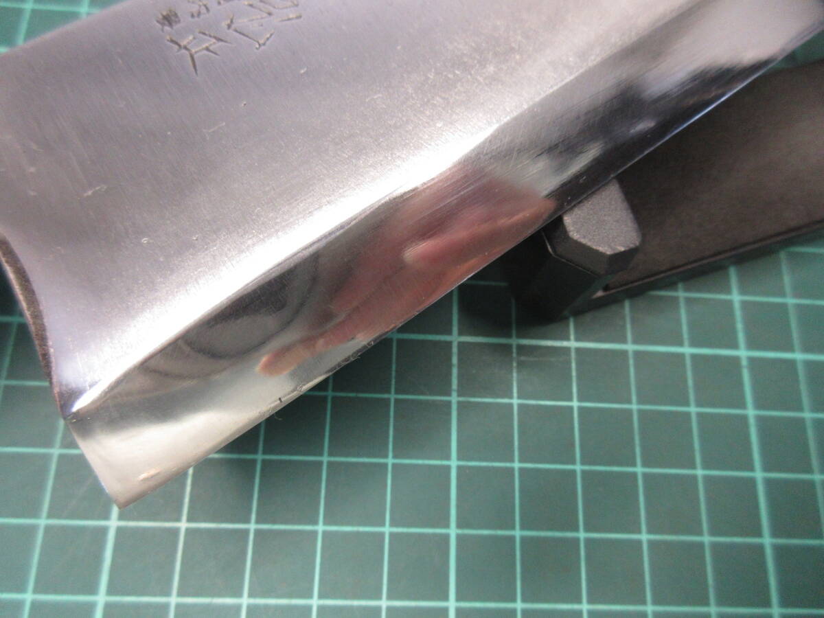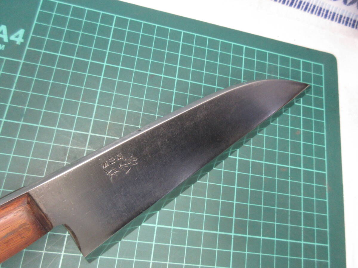 「受取連絡」が出来ない方の入札はお断りします。 こちらから評価を入れることはありません。 ■■■■■■■■■■■■■■■■■■■■■■■■■■■■■■■■■ 洋出刃20cm 片刃 刃が鉈のように鈍角です、細かい作業は難しいと思います。骨切り? 全鋼で直ぐ錆びます。(恐らく中子まで全て鋼です。) 峰厚で600gと重いです。裏すきは無くフラットです。 癖のある特殊包丁です。 最後の写真は磨き前です。 歪みや反り、落としきれない錆があります。全体的に使用感があります。 包丁のみの出品です、付属品はありません。 ■■■■■■■■■■■■■■■■■■■■■■■■■■■■■■■■■ 発送は着払いゆうパック60サイズです。 以下は定型文です。 洋包丁は両刃、和包丁は片刃を前提に出品しています。 (タイトルと個別情報に刃付けの記載が無ければ上記のとおりです) 他の出品物と同梱できます。(システム上、着払いとのまとめ依頼ができません。落札後に同梱希望のメッセージを 頂ければ対応します。) 送料と材質についての質問には返答しません。 包丁につきましては全てジャンクとし、ノークレームノーリターンでお願いします。 出品からお品物が届くまでに時間が掛かった場合、鋼などの材質ですと変色や錆などの変質がある場合がございますのでご了承ください。 錆の酷い包丁は再生研磨していますが、あくまで素人仕事です。電動工具を用いての仕上げです。 削る、磨くは出来ますが歪みの修正は出来ません。中古品ですので歪みがある前提で入札してください。 磨きにより錆に強くなるメリットがありますが切った食材が張り付くデメリットがあります。 切れ味が悪いや、思ったより汚いなどのクレームはご遠慮ください。 触れば怪我をするほどの最低限の刃付けはしてあります、開封時にご注意ください。 肉眼での検品ですので微細な傷や欠けを見落としている可能性もありますので写真を参照してください。 現状維持のために防錆に椿油を塗布していることがありますので写真に不自然な艶が写っている時があります、ご了承ください。 (鋼の洋包丁の場合は中子にも塗布するために柄にも油が散布しています。ご使用前に洗浄してください。) 中子やリベットの錆を落とす為に柄ごと研磨する場合がありますので、柄に研磨痕が残っている時があります。 柄の仕上げに軽く蝋引きしています。 片刃の場合、研ぎですが砥石傷が付くのを嫌ってベタ研ぎはせず、峰をわずかに浮かして仕上げています。(綺麗な裏押しの和包丁はベタ研ぎです) 10対0ではなく9対1位の感覚です、完璧な片刃をお求めの方は入札をご遠慮ください。 (和包丁は片刃前提です、洋包丁が片刃の場合にはタイトルと個別情報に片刃と記載してあります) 有効利用、再生利用できる方の入札をおまちしています。 写真で判断いただき、商品説明を理解出来る方のみ入札をお願いします。 クリーニングなどはせず、写真のままお送りします。 専門知識が乏しい為、質問に答えられない時があります。 ブランド品の真偽については不明とさせて頂きます。 素人による中古出品です、すり替え防止の為にもノークレームノーリターンでお願いします。 入金を確認しました時点でお取り置き終了と判断し発送準備にはいります。 同梱発送、お取り置きを希望の方は入金前に連絡頂くと助かります。 落札後、48時間以内の初回連絡、五日以内の入金が確認出来ません場合は落札者様都合のキャンセルとさせて頂きます。 その場合落札者様に非常に悪い評価とブラックリストへの登録を同時に行いますのでご了承ください。 (以後こちらのオークションに入札が出来なくなります) #お取引に不安を感じる評価の方は削除させて頂く事があります。 #総合評価が高くても直近に悪い評価がある方も削除致します。 #いたずら入札を防ぐ為、1万円以上の入札額時の場合は新規の方の入札をお断りします。 #(どうしても入札したい時は質問欄より入札意思をお伝えください。) *評価を入れて頂くと反射的にお返しする形を取っています、不要の方は評価を入れないで下さい。 *こちらから評価をお付けすることはありません、不要の方は「受取連絡」で終了して下さい。 自己紹介欄もあわせてお読みください。 | ||