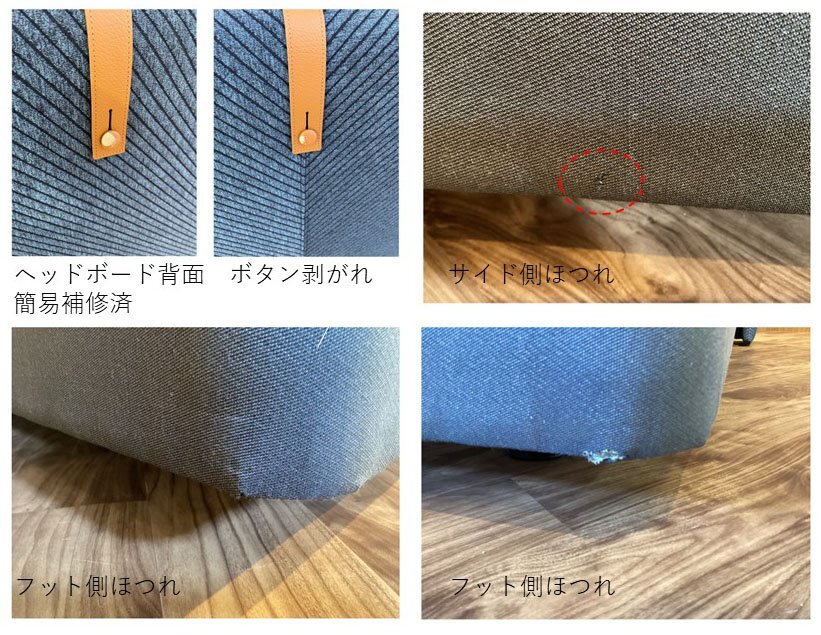 画像10枚目のようにヘッドボード背面のボタンが3個の内2個はがれがございますが、これ以上はがれないように補修しております。