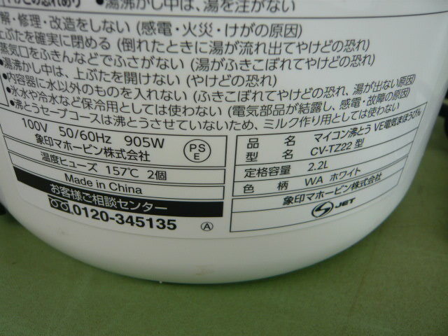 BA419◆象印 マイコン沸とうVE電気まほうびん 2.2L ホワイトZOJIRUSHI 優湯生(ゆうとうせい) CV-TZ22-WA 電気ポット◆動作品◆I