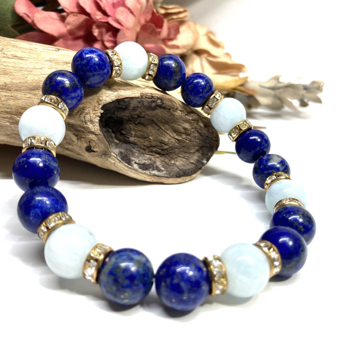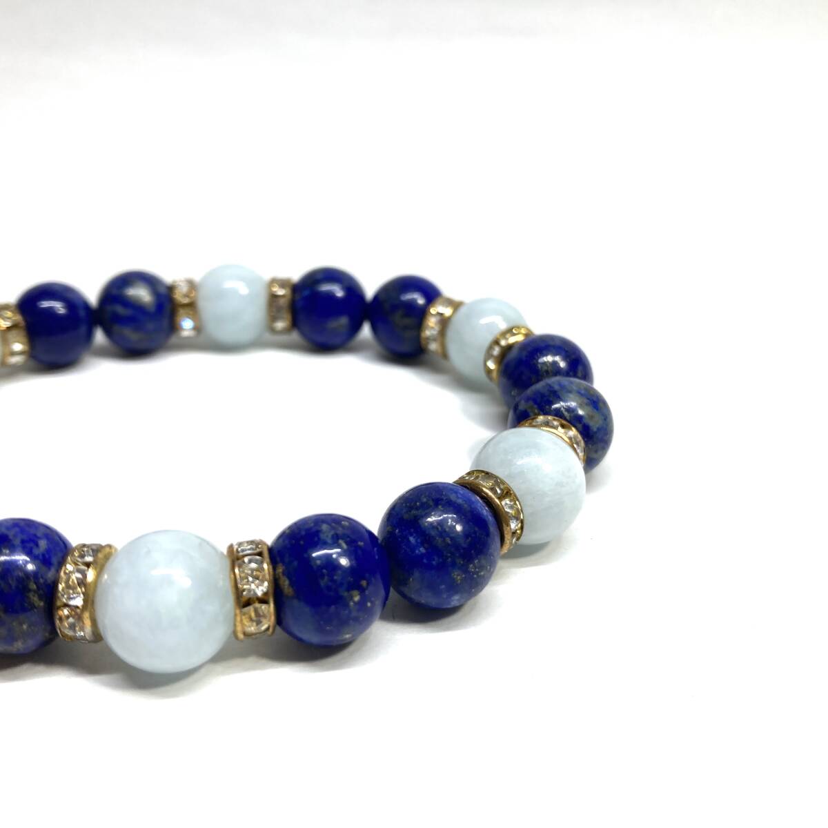 こちらは、ラピスラズリとアクアマリンを組み合わせたパワーストーンブレスレットです。間にはロンデルを挟み高級感あるデザインに仕上げております。石大きさは腕にも馴染みやすいように10mm玉で内径約18cm(伸可能)です。(サイズ変更の場合は取引ナビにてご連絡をお願いします。) 数に限りがございますので気になる方はお早めにどうぞ。