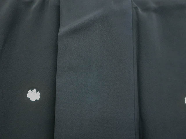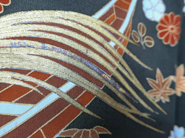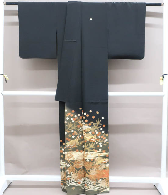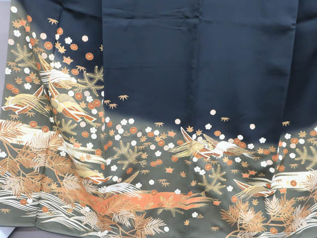 リサイクル商品のため、衿折れ山、左前身頃・衽など薄汚れ、箔剥がれ、黒ずみがございますがご着用いただけると存じます。 地色は黒です。 1枚目の画像が近いお色かと思われます。 素材は正絹です。 |