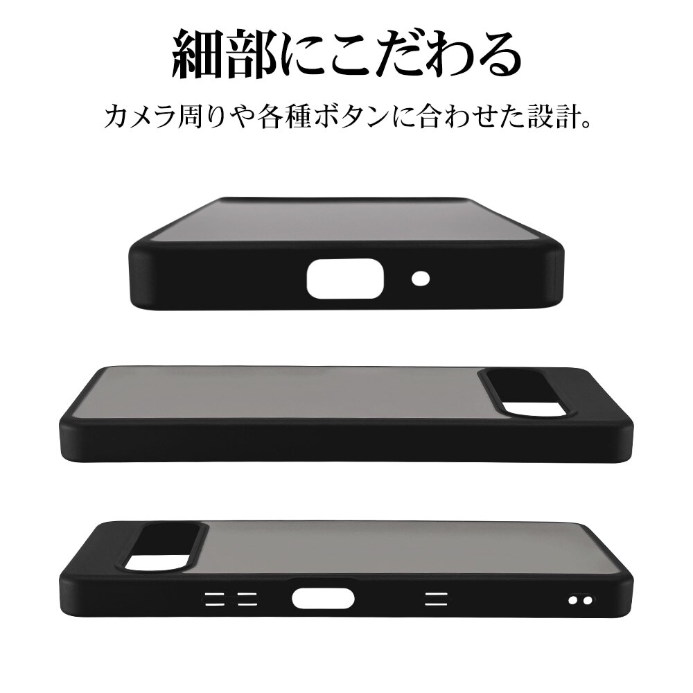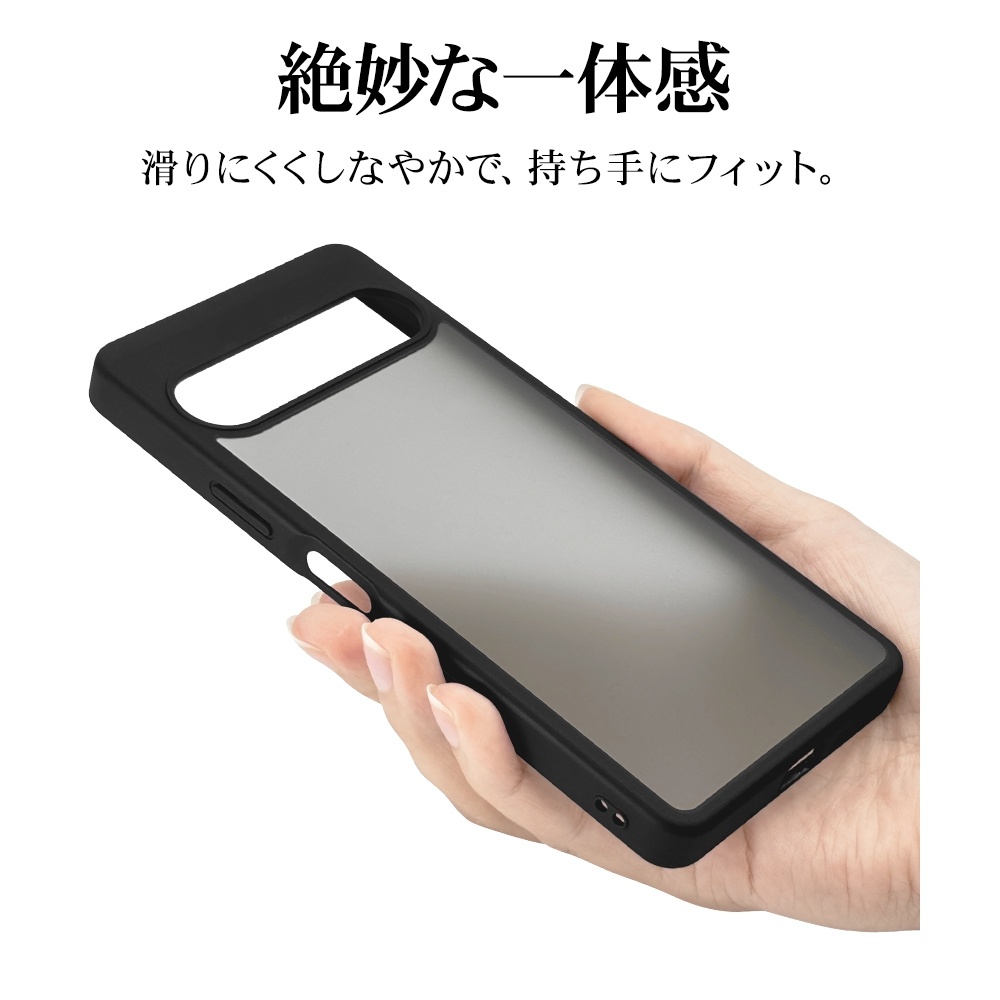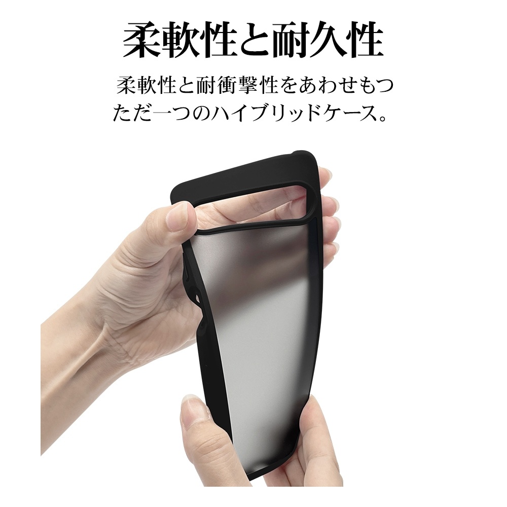 本製品は側面は柔軟なTPU、背面は傷に強いアクリル素材のハイブリッド背面ケースです。側面は弾力と柔軟性を兼ね備えたTPU素材で端末を衝撃から保護。保護性能と装着感を追求した約1.5mmの厚めのデザイン。