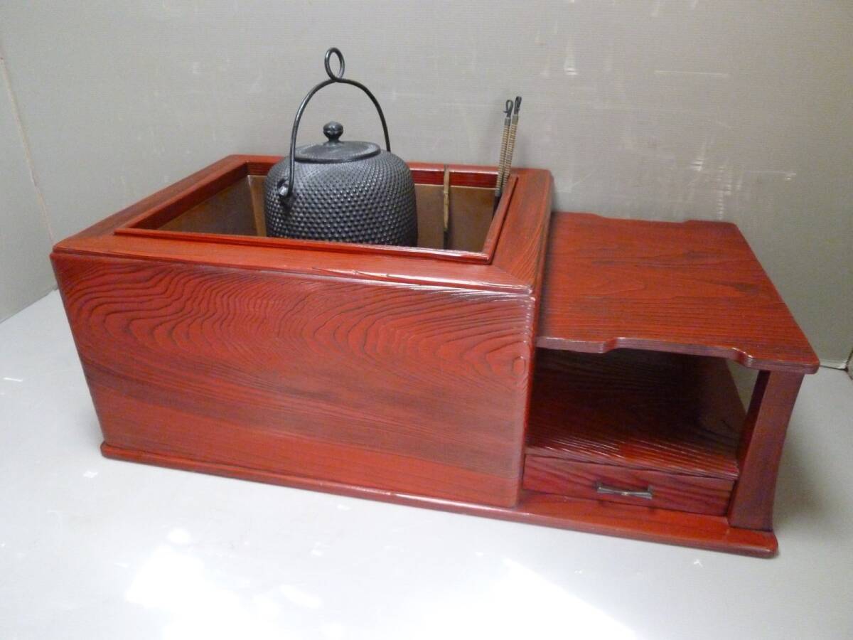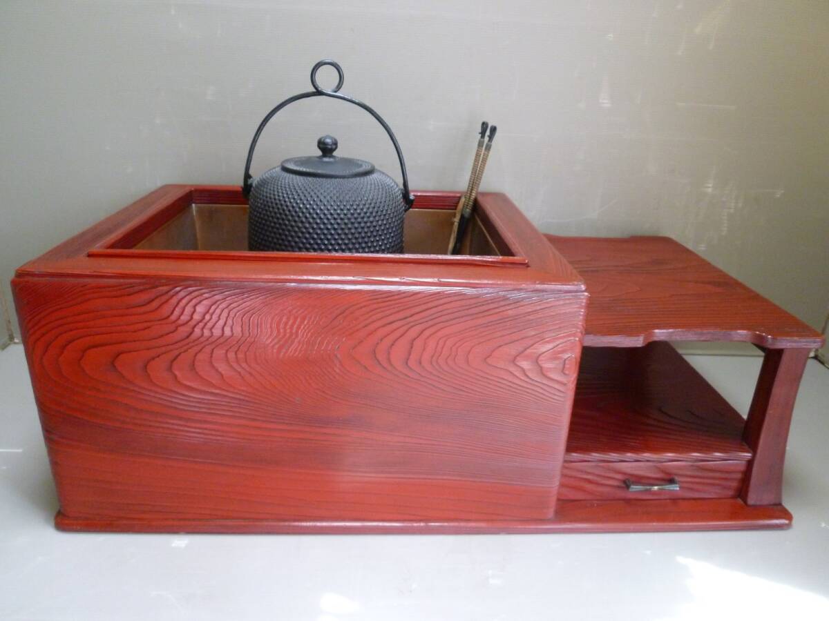 | 幅74奥行40座高27センチ 落とし37×28深さ15センチ 重量8.4kg 袖板寸法36×24センチ 霰鉄瓶湯沸かし五徳火箸灰匙付き 外観杉木目が美しい朱摺漆塗状態はご覧のように概ね良好です.宅急便160サイズ¥3020~¥4680発送です. | ||