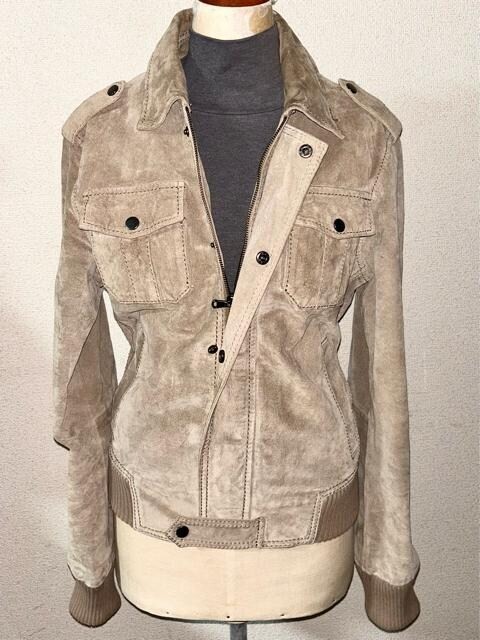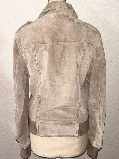 スエード皮はよく擦れる箇所が色濃くなる性質なので一例として襟内のアップ画像参照下さい