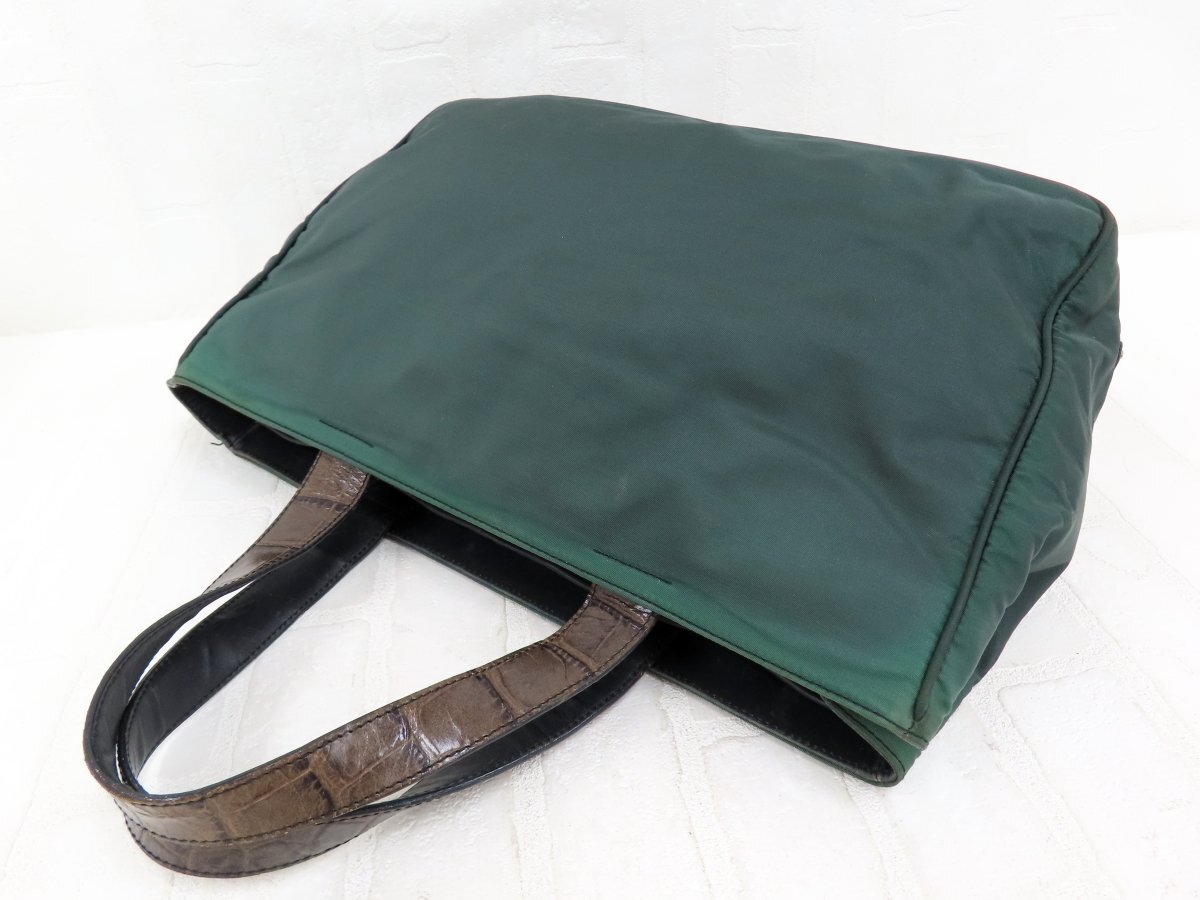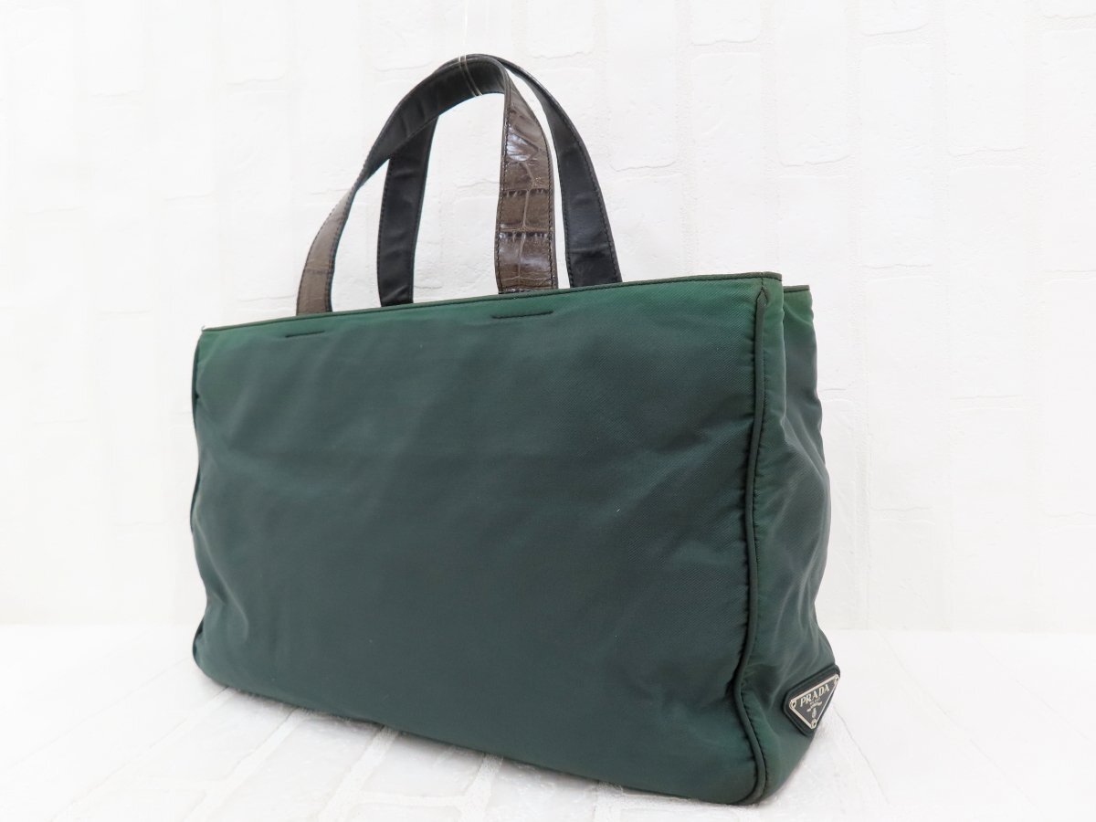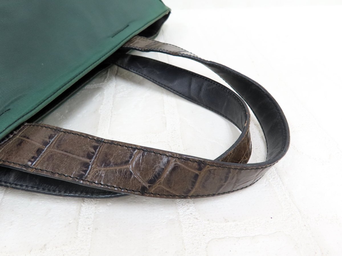 ◆美品◆PRADA プラダ◆ナイロン クロコ型押し レザー 本革◆ハンド トート バッグ◆グリーン 茶 シルバー金具◆イタリア製◆A13756