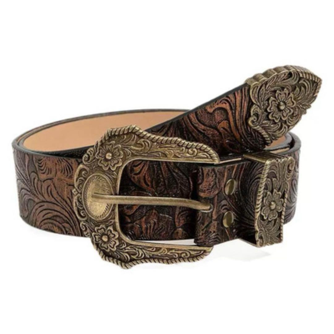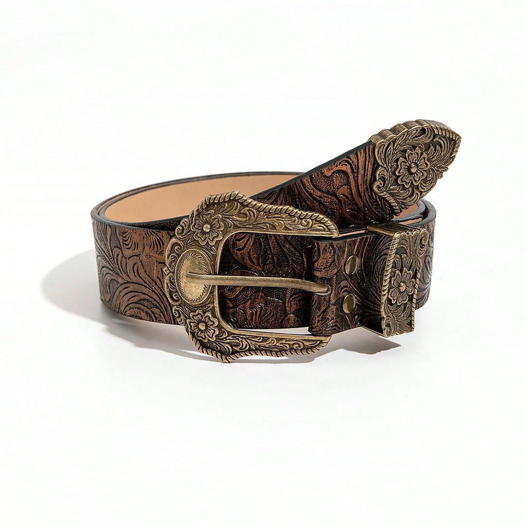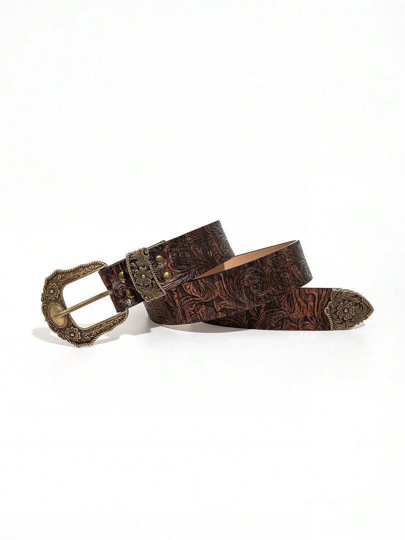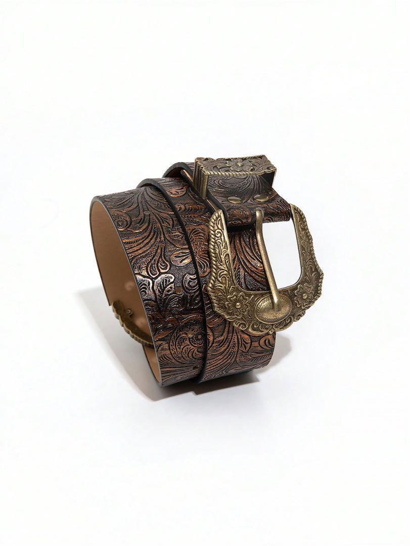 深みのあるブラウンに、繊細なフラワー調の型押し模様が施され、アンティークゴールドのバックルが上品な存在感を放ちます。